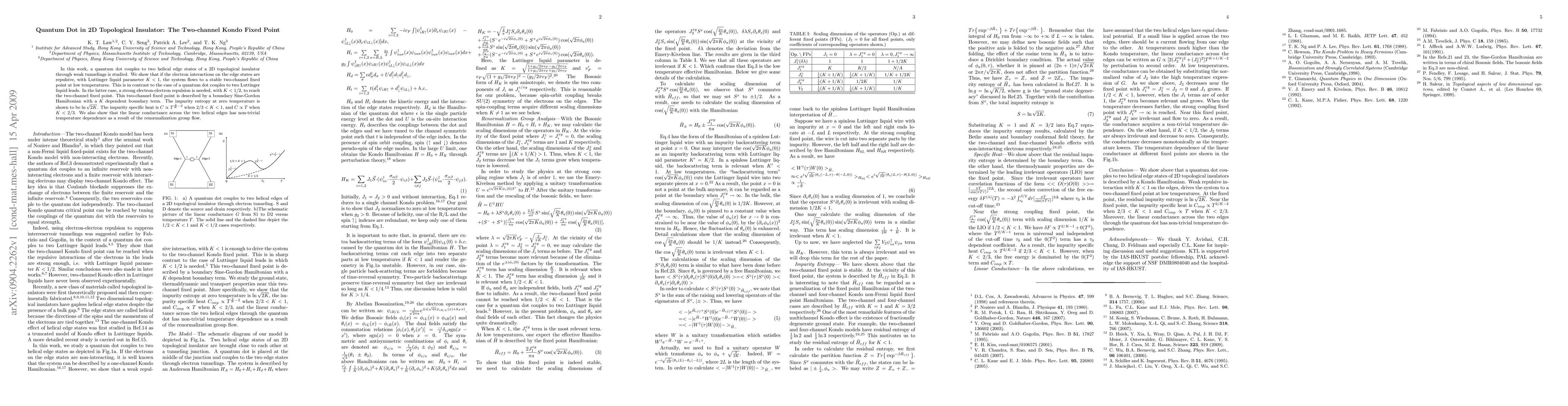 In this work, a quantum dot couples to two helical edge states of a 2D topological insulator through weak tunnelings is studied. We show that if the electron interactions on the edge states are repulsive, with Luttinger liquid parameter $ K < 1 $, the system flows to a stable two-channel fixed point at low temperatures. This is in contrast to the case of a quantum dot couples to two Luttinger liquid leads. In the latter case, a strong electron-electron repulsion is needed, with $ K<1/2 $, to reach the two-channel fixed point. This two-channel fixed point is described by a boundary Sine-Gordon Hamiltonian with a $K$ dependent boundary term. The impurity entropy at zero temperature is shown to be $ \ln\sqrt{2K} $. The impurity specific heat is $C \propto T^{\frac{2}{K}-2}$ when $ 2/3 < K < 1 $, and $ C \propto T$ when $ K<2/3$. We also show that the linear conductance across the two helical edges has non-trivial temperature dependence as a result of the renormalization group flow.
