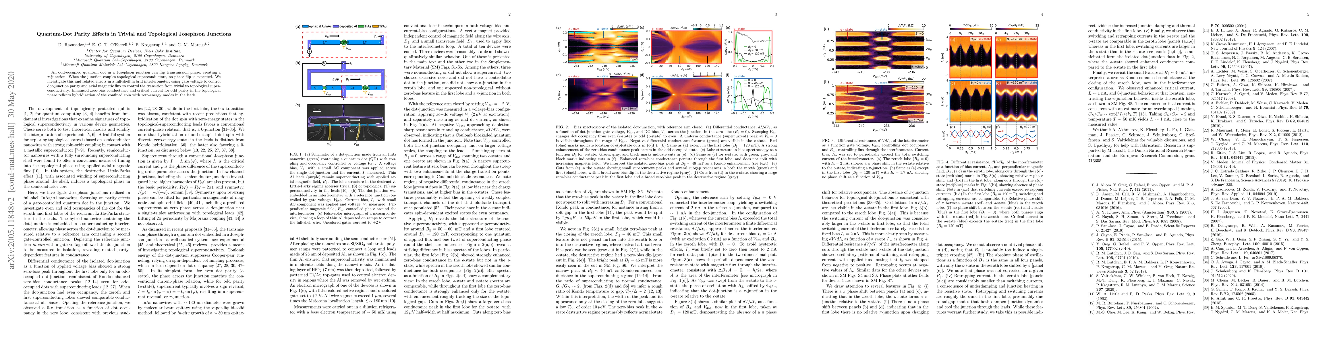 This paper explores how quantum-dot parity influences Josephson junctions, showing that odd-parity in a full-shell hybrid interferometer can create a π-junction effect. The study finds enhanced zero-bias conductance and critical current for odd parity in topological superconductivity, indicating spin-mode hybridization.