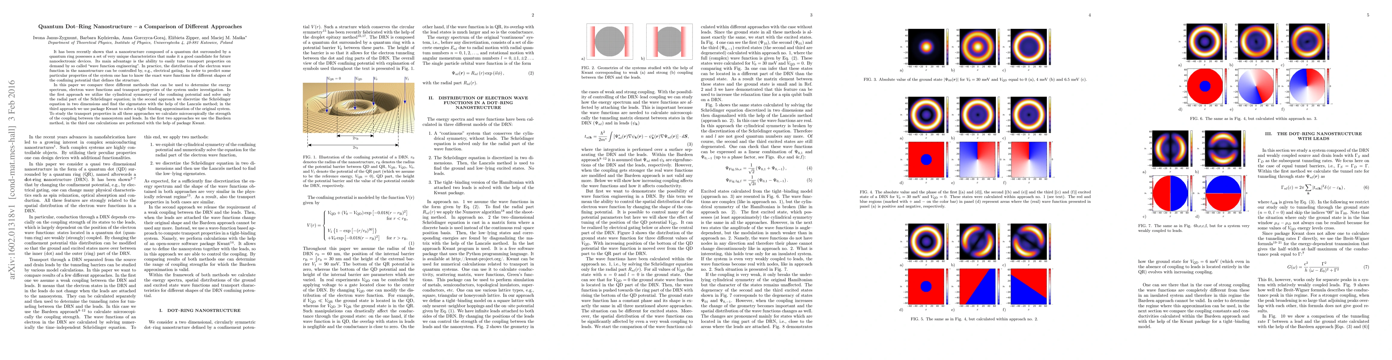 It has been recently shown that a nanostructure composed of a quantum dot surrounded by a quantum ring possesses a set of very unique characteristics that make it a good candidate for future nanoelectronic devices. Its main advantage is the ability to easily tune transport properties on demand by so called "wave function engineering". In practice, the distribution of the electron wave function in the nanostructure can be controlled by, e.g., electrical gating. In order to predict some particular properties of the system one has to know the exact wave functions for different shapes of the confining potential that defines the structure. In this paper we compare three different methods that can be used to determine the energy spectrum, electron wave functions and transport properties of the system under investigation. In the first approach we utilize the cylindrical symmetry of the confining potential and solve only the radial part of the Schrodinger equation; in the second approach we discretize the Schrodinger equation in two dimensions and find the eigenstates with the help of the Lanczos method; in the third approach we use package Kwant to solve a tight-binding approximation of the original system. To study the transport properties in all these approaches we calculate microscopically the strength of the coupling between the nanosystem and leads. In the first two approaches we use the Bardeen method, in the third one calculations are performed with the help of package Kwant.