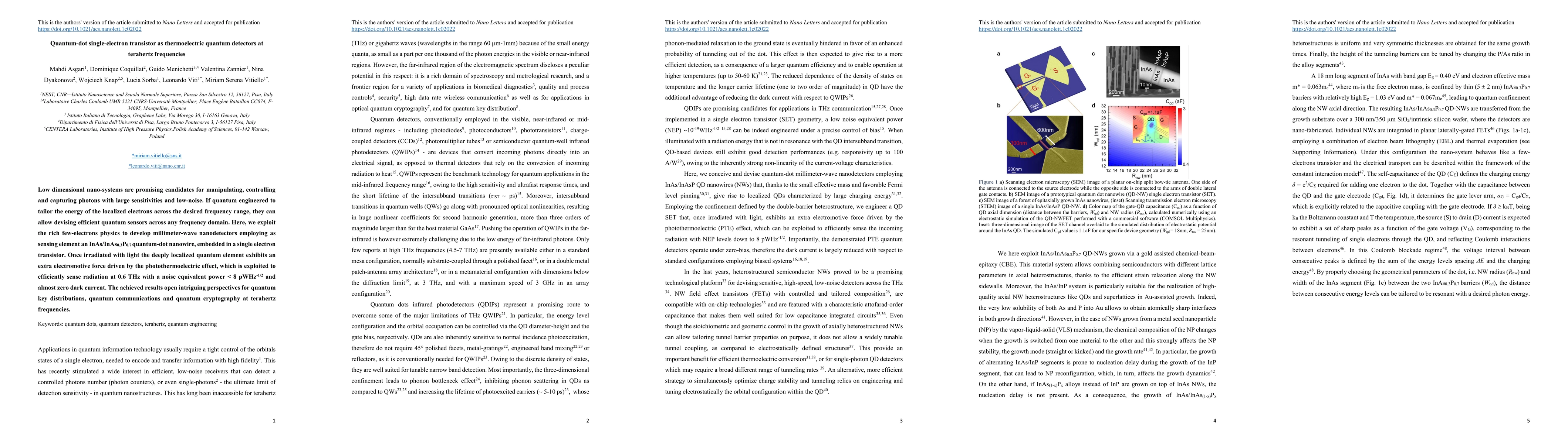 This paper develops a quantum-dot single-electron transistor for efficient terahertz detection, leveraging the photothermoelectric effect in an InAs/InAs0.3P0.7 quantum-dot nanowire to achieve low-noise detection at 0.6 THz with high sensitivity. The technology holds promise for quantum key distribution and quantum communications.