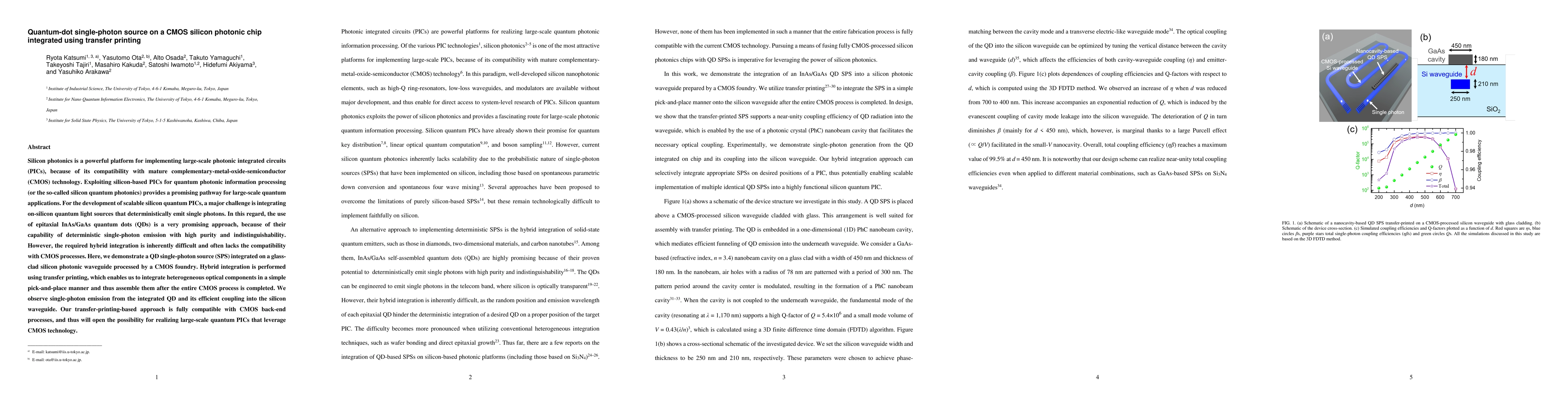 This paper demonstrates the integration of InAs/GaAs quantum-dot single-photon sources onto a CMOS silicon photonic chip using transfer printing, addressing the challenge of hybrid integration for scalable quantum photonic information processing. The method allows efficient coupling of single photons into the waveguide and compatibility with CMOS back-end processes.
