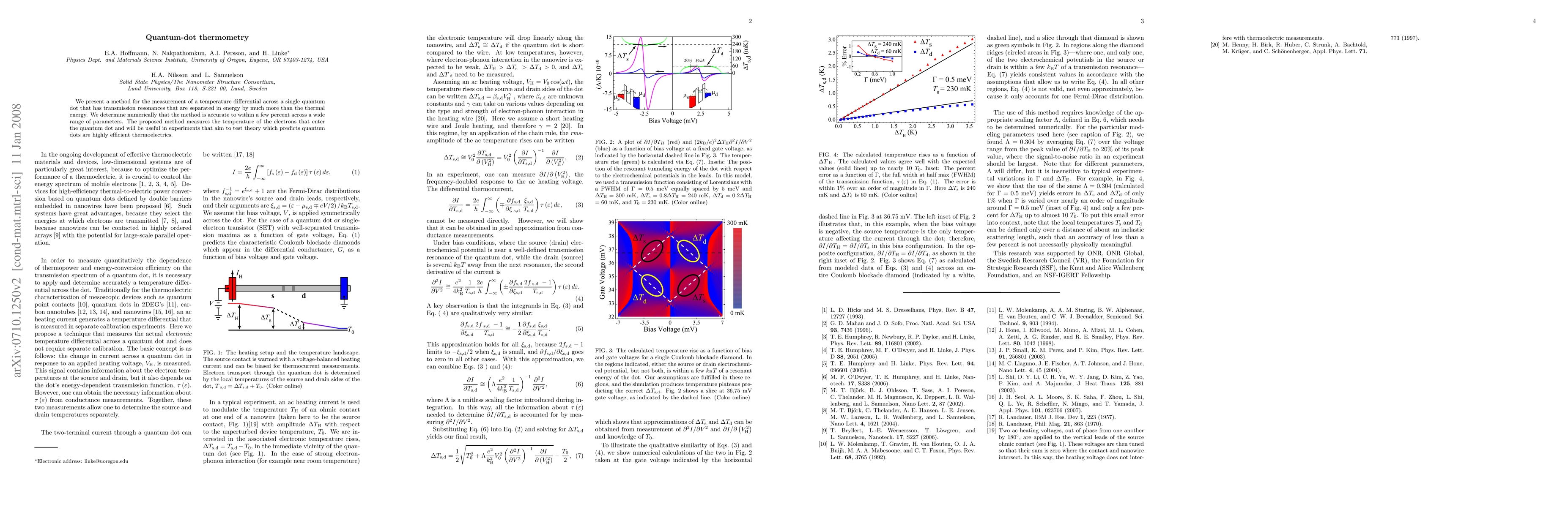 We present a method for the measurement of a temperature differential across a single quantum dot that has transmission resonances that are separated in energy by much more than the thermal energy. We determine numerically that the method is accurate to within a few percent across a wide range of parameters. The proposed method measures the temperature of the electrons that enter the quantum dot and will be useful in experiments that aim to test theory which predicts quantum dots are highly-efficient thermoelectrics.