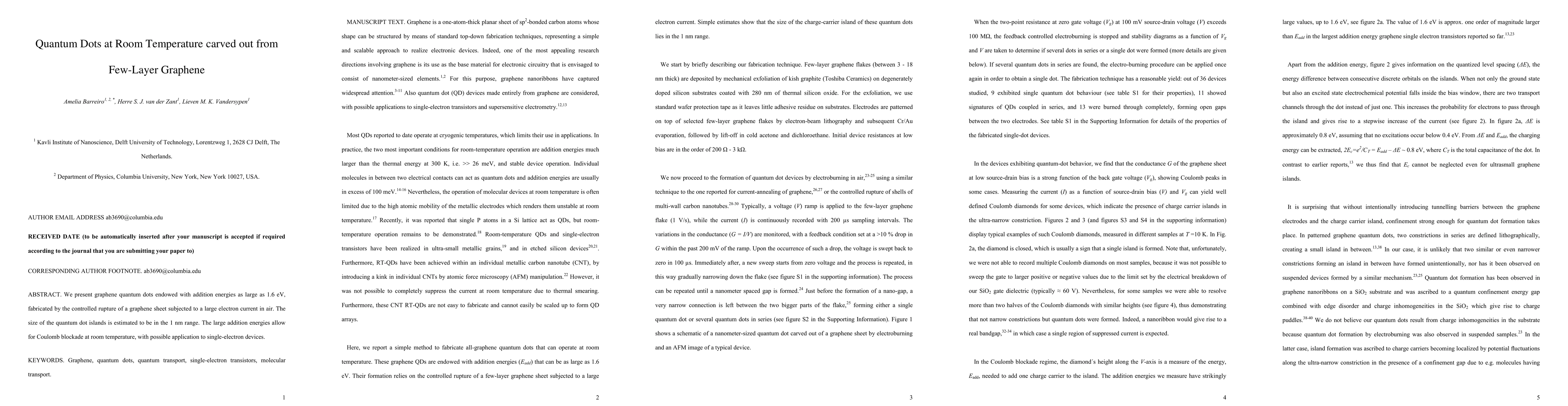 Researchers created graphene quantum dots with large addition energies, allowing for Coulomb blockade at room temperature, paving the way for single-electron devices.