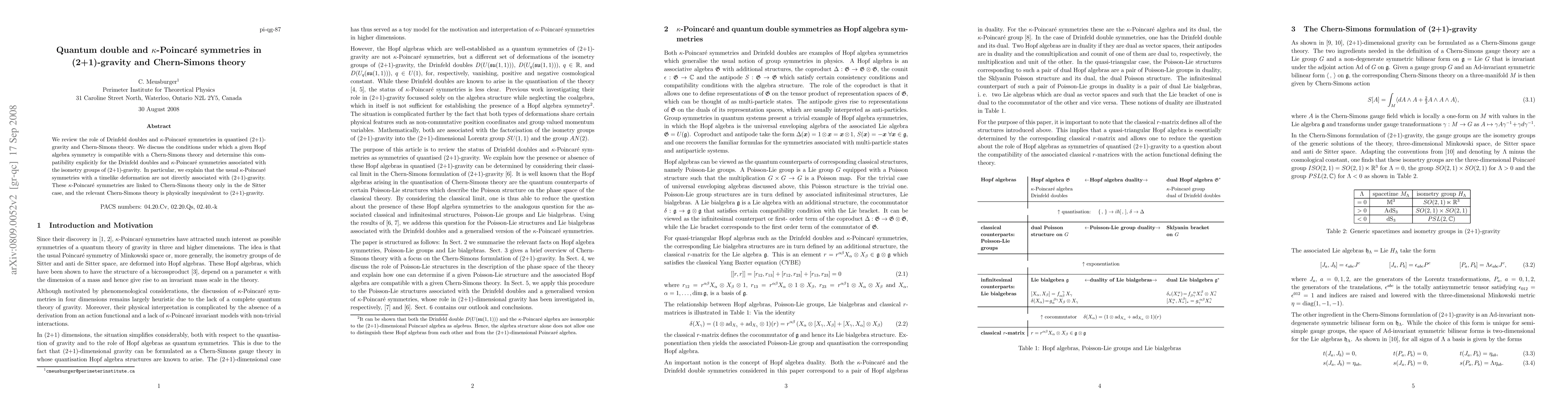 This paper reviews Drinfeld doubles and kappa-Poincaré symmetries in (2+1)-gravity and Chern-Simons theory, determining their compatibility conditions. It finds that usual kappa-Poincaré symmetries do not directly relate to (2+1)-gravity but are instead linked to Chern-Simons theory, specifically in the de Sitter case, where they are inequivalent to (2+1)-gravity.