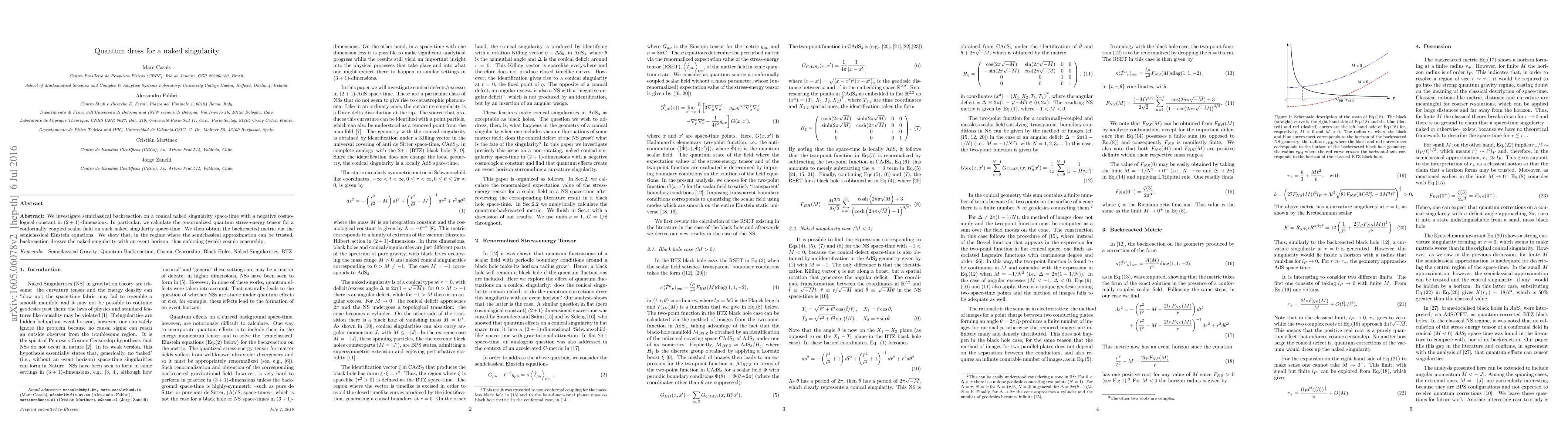 We investigate semiclassical backreaction on a conical naked singularity space-time with a negative cosmological constant in (2+1)-dimensions. In particular, we calculate the renormalized quantum stress-energy tensor for a conformally coupled scalar field on such naked singularity space-time. We then obtain the backreacted metric via the semiclassical Einstein equations. We show that, in the regime where the semiclassical approximation can be trusted, backreaction dresses the naked singularity with an event horizon, thus enforcing cosmic censorship.