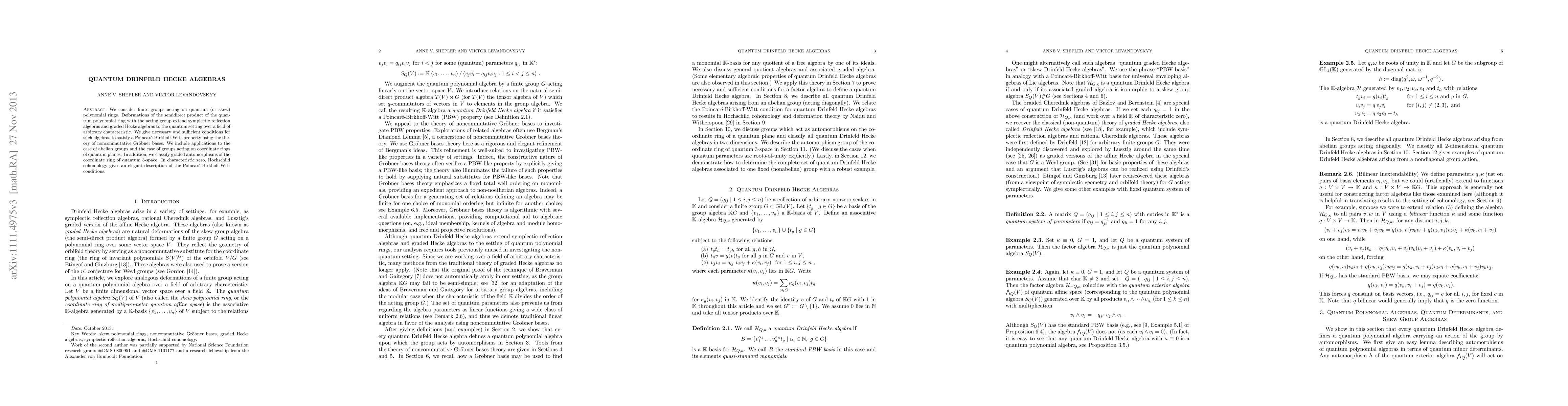 This paper explores quantum Drinfeld Hecke algebras, extending symplectic reflection and graded Hecke algebras to quantum polynomial rings via group actions. It provides conditions for Poincare-Birkhoff-Witt property using noncommutative Groebner bases, with applications to abelian groups and quantum planes. The research also classifies automorphisms of quantum 3-space's coordinate ring, offering Hochschild cohomology description in characteristic zero.