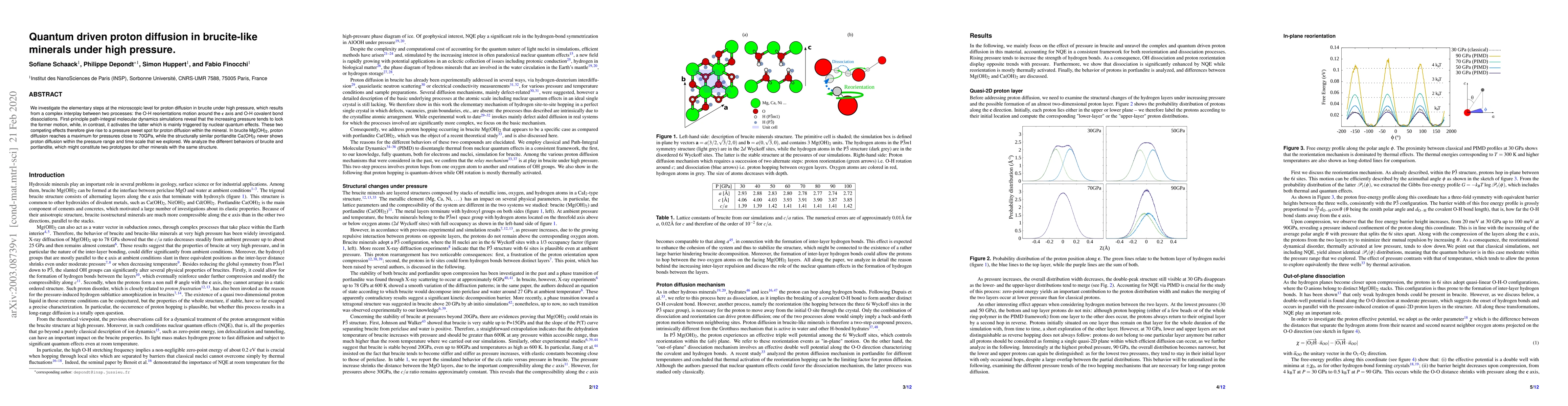 This research uses quantum-driven simulations to reveal that proton diffusion in brucite mineral peaks at around 70 GPa pressure, due to a balance between O-H reorientations and covalent bond dissociations. In contrast, structurally similar portlandite shows no proton diffusion within the studied pressure range and time scale, suggesting distinct behaviors based on their compositions.