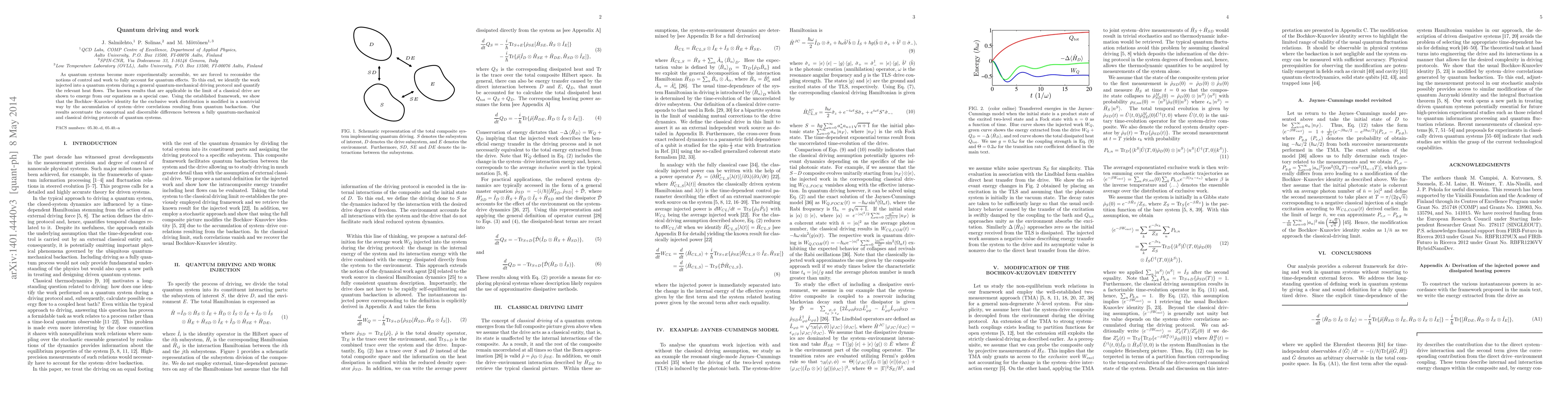 The paper presents a theoretical framework for defining work in quantum systems undergoing general quantum-mechanical driving protocols, modifying the Bochkov-Kuzovlev identity to account for quantum backaction effects.