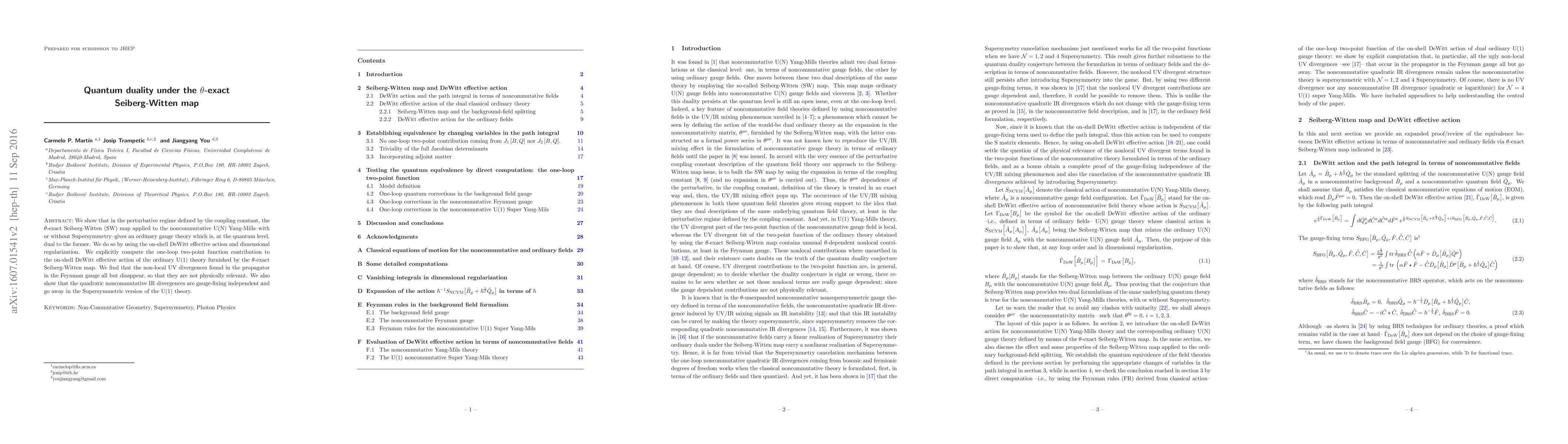 We show that in the perturbative regime defined by the coupling constant, the theta-exact Seiberg-Witten map applied to noncommutative U(N) Yang-Mills --with or without Supersymmetry-- gives an ordinary gauge theory which is, at the quantum level, dual to the former. We do so by using the on-shell DeWitt effective action and dimensional regularization. We explicitly compute the one-loop two-point function contribution to the on-shell DeWitt effective action of the ordinary U(1) theory furnished by the theta-exact Seiberg-Witten map. We find that the non-local UV divergences found in the propagator in the Feynman gauge all but disappear, so that they are not physically relevant. We also show that the quadratic noncommutative IR divergences are gauge-fixing independent and go away in the Supersymmetric version of the U(1) theory.