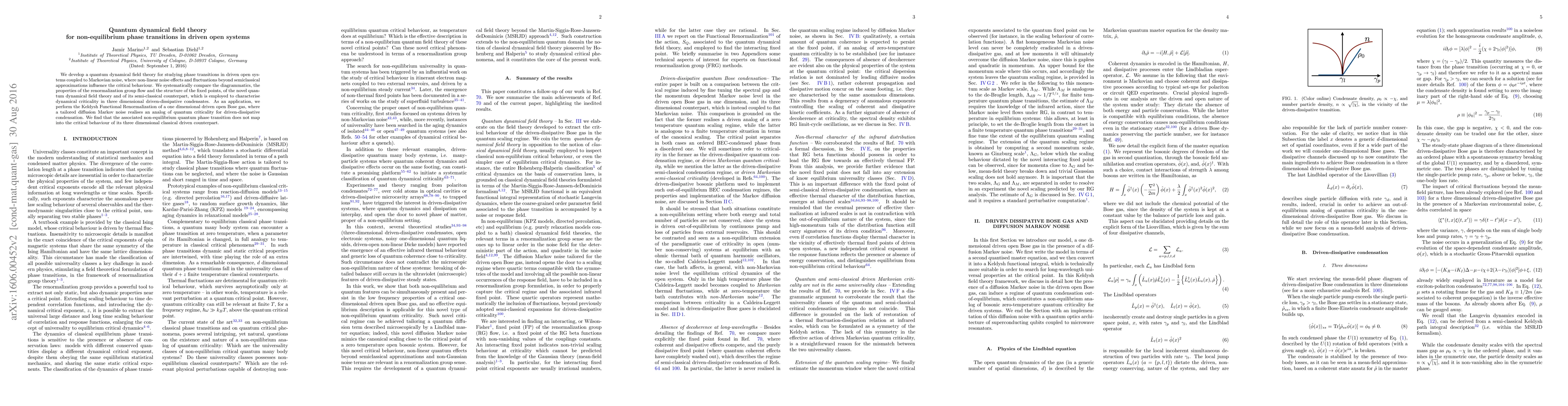 This paper develops a quantum dynamical field theory to study non-equilibrium phase transitions in driven open systems, comparing its properties with a semi-classical counterpart. It finds that the non-equilibrium quantum phase transition in a one-dimensional driven Bose gas does not align with the critical behavior of its three-dimensional classical counterpart.