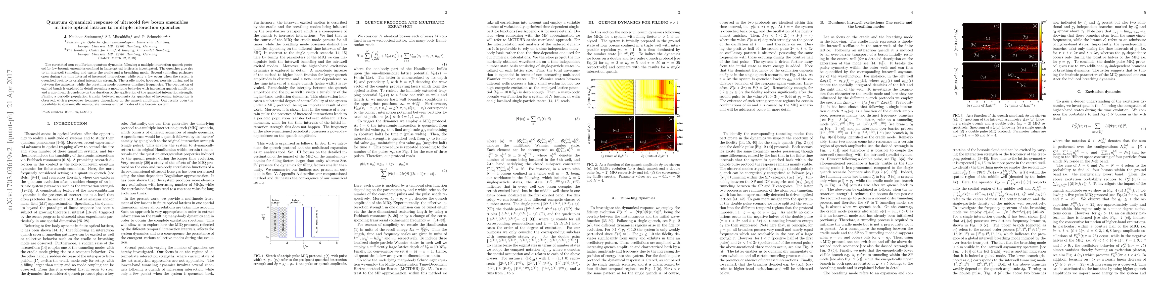 The correlated non-equilibrium quantum dynamics following a multiple interaction quench protocol for few-bosonic ensembles confined in finite optical lattices is investigated. The quenches give rise to an interwell tunneling and excite the cradle and a breathing mode. Several tunneling pathways open during the time interval of increased interactions, while only a few occur when the system is quenched back to its original interaction strength. The cradle mode, however, persists during and in between the quenches, while the breathing mode possesses dinstinct frequencies. The occupation of excited bands is explored in detail revealing a monotonic behavior with increasing quench amplitude and a non-linear dependence on the duration of the application of the quenched interaction strength. Finally, a periodic population transfer between momenta for quenches of increasing interaction is observed, with a power-law frequency dependence on the quench amplitude. Our results open the possibility to dynamically manipulate various excited modes of the bosonic system.