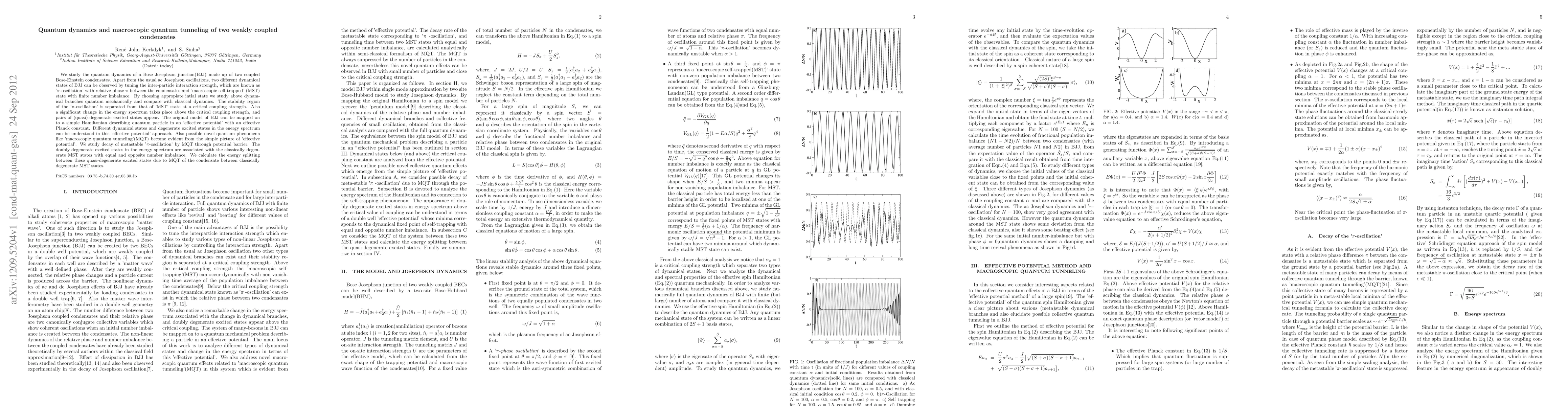 We study the quantum dynamics of a Bose Josephson junction(BJJ) made up of two coupled Bose-Einstein condensates. Apart from the usual ac Josephson oscillations, two different dynamical states of BJJ can be observed by tuning the inter-particle interaction strength, which are known as '$\pi$-oscillation' with relative phase $\pi$ between the condensates and 'macroscopic self-trapped' (MST) state with finite number imbalance. By choosing appropiate intial state we study above dynamical branches quantum mechanically and compare with classical dynamics. The stability region of the '$\pi$-oscillation' is separated from that of 'MST' state at a critical coupling strength. Also a significant change in the energy spectrum takes place above the critical coupling strength, and pairs of (quasi)-degenerate excited states appear. The original model of BJJ can be mapped on to a simple Hamiltonian describing quantum particle in an 'effective potential' with an effective Planck constant. Different dynamical states and degenerate excited states in the energy spectrum can be understood in this 'effective potential' approach. Also possible novel quantum phenomena like 'macroscopic quantum tunneling'(MQT) become evident from the simple picture of 'effective potential'. We study decay of metastable '$\pi$-oscillation' by MQT through potential barrier. The doubly degenerate excited states in the energy spectrum are associated with the classically degenerate MST states with equal and opposite number imbalance. We calculate the energy splitting between these quasi-degenerate excited states due to MQT of the condensate between classically degenerate MST states.