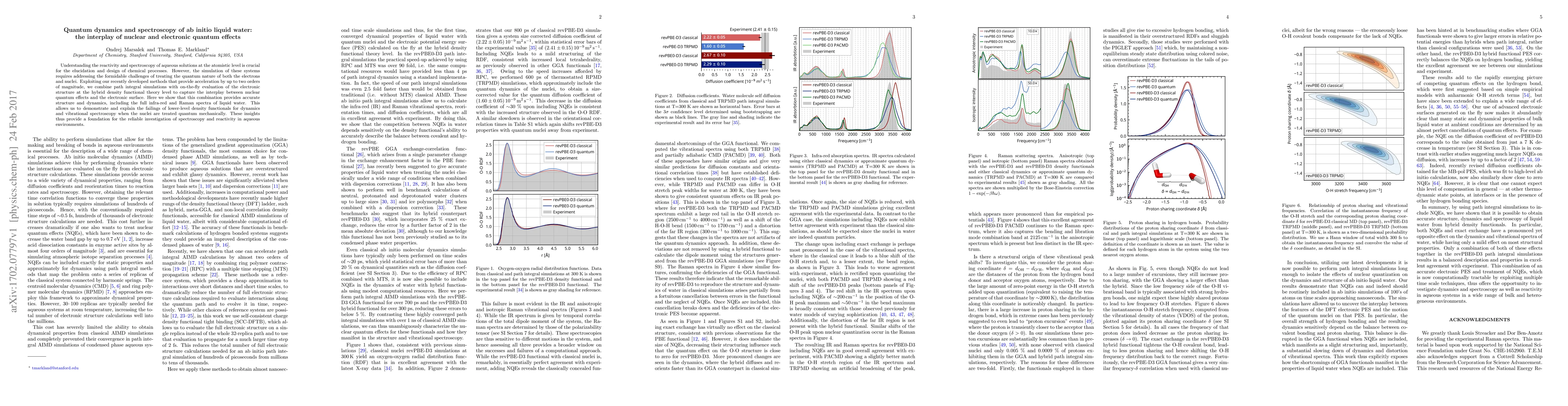 This paper combines advanced quantum simulations with hybrid density functional theory to accurately model the quantum dynamics and spectroscopy of liquid water, revealing the importance of nuclear quantum effects and improving the understanding of aqueous solution reactivity. The study highlights the limitations of lower-level density functionals when treating nuclei quantum mechanically, providing a robust framework for future aqueous environment studies.