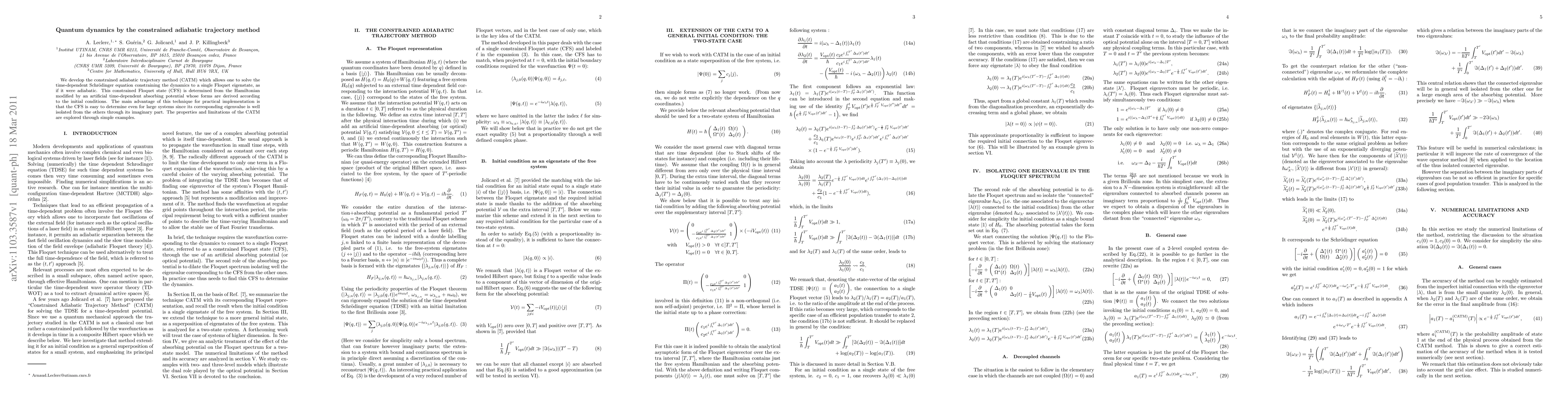 The constrained adiabatic trajectory method (CATM) solves the time-dependent Schrödinger equation by constraining dynamics to a single Floquet eigenstate, determined via an artificial absorbing potential. This method is practical for large systems due to the well-isolated eigenvalue of the constrained Floquet state.