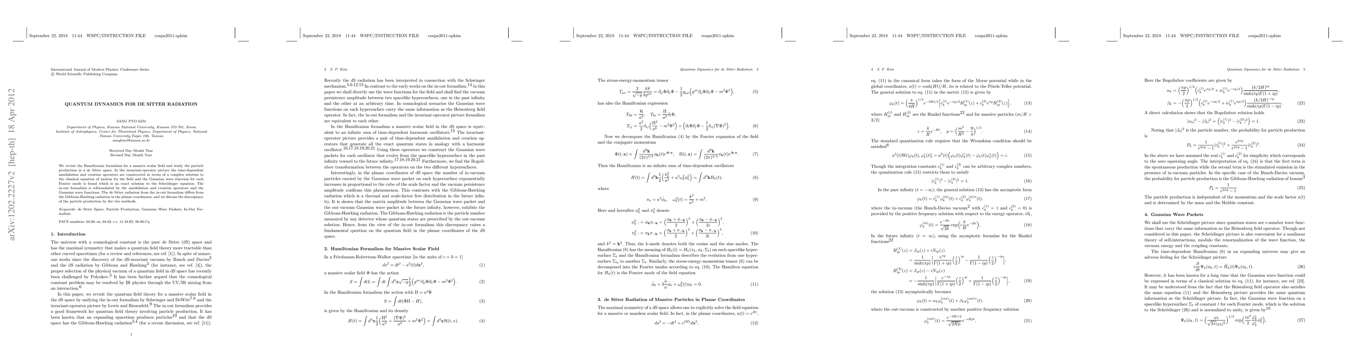 We revisit the Hamiltonian formalism for a massive scalar field and study the particle production in a de Sitter space. In the invariant-operator picture the time-dependent annihilation and creation operators are constructed in terms of a complex solution to the classical equation of motion for the field and the Gaussian wave function for each Fourier mode is found which is an exact solution to the Schr\"odinger equation. The in-out formalism is reformulated by the annihilation and creation operators and the Gaussian wave functions. The de Sitter radiation from the in-out formalism differs from the Gibbons-Hawking radiation in the planar coordinates, and we discuss the discrepancy of the particle production by the two method
