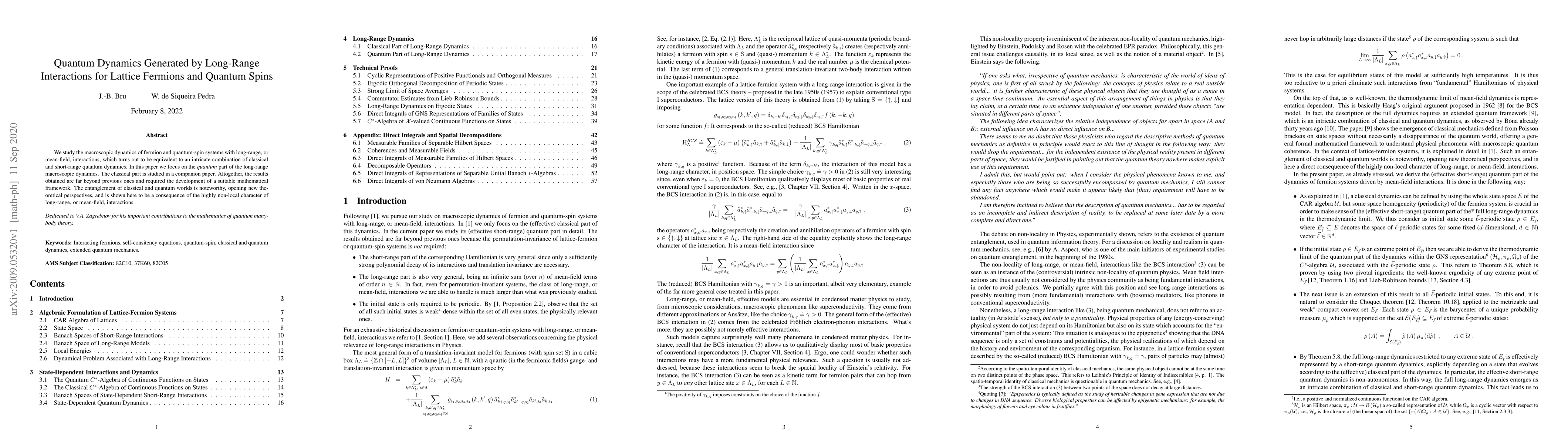 This paper investigates the quantum dynamics of lattice fermions and quantum spins under long-range interactions, revealing a complex interplay between classical and quantum dynamics. The study develops a new mathematical framework to understand the entanglement between classical and quantum realms, highlighting the non-local nature of long-range interactions.