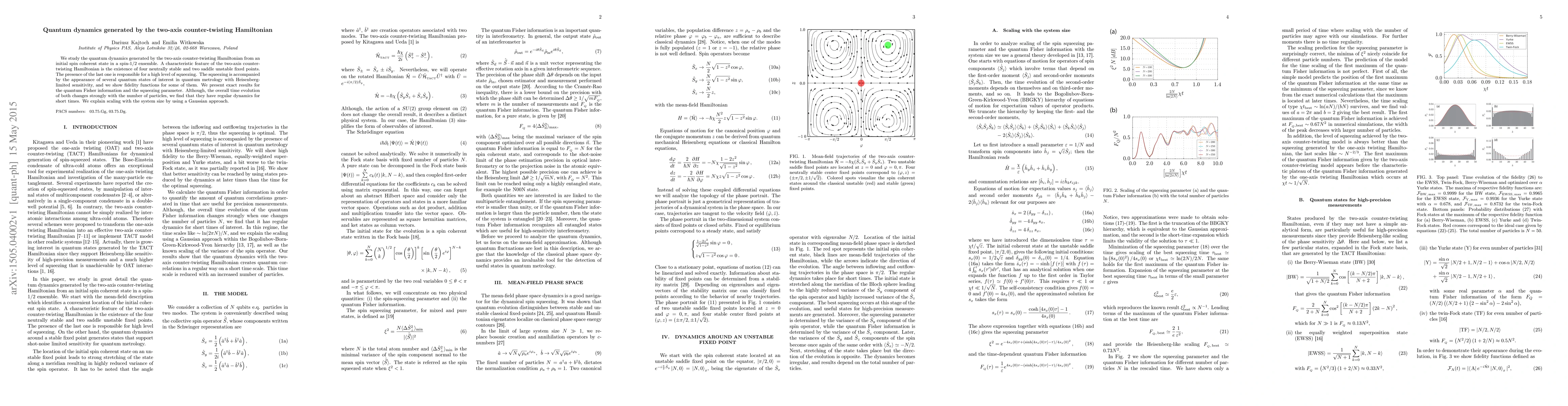 We study the quantum dynamics generated by a two-axis counter-twisting Hamiltonian from an initial spin coherent state in a spin-$1/2$ ensemble. A characteristic feature of the two-axis counter-twisting Hamiltonian is the existence of four neutrally stable and two saddle unstable fixed points. The presence of the last one is responsible for a high level of squeezing. The squeezing is accompanied by the appearance of several quantum states of interest in quantum metrology with Heisenberg-limited sensitivity, and we show fidelity functions for some of them. We present exact results for the quantum Fisher information and the squeezing parameter. Although, the overall time evolution of both changes strongly with the number of particles, we find that they have regular dynamics for short times. We explain scaling with the system size by using a Gaussian approach.