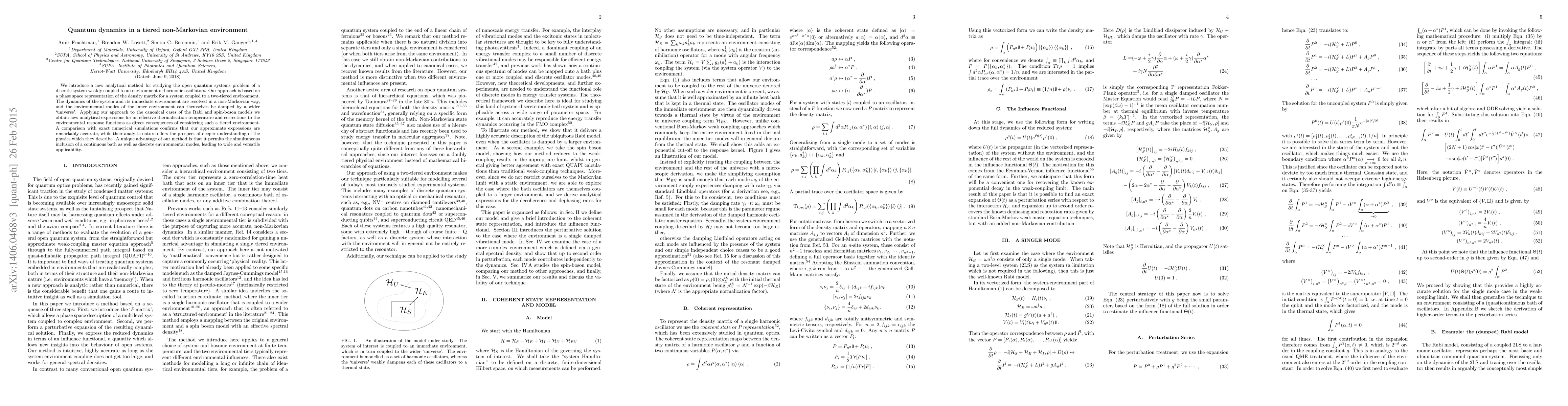 We introduce a new analytical method for studying the open quantum systems problem of a discrete system weakly coupled to an environment of harmonic oscillators. Our approach is based on a phase space representation of the density matrix for a system coupled to a two-tiered environment. The dynamics of the system and its immediate environment are resolved in a non-Markovian way, and the environmental modes of the inner environment can themselves be damped by a wider `universe'. Applying our approach to the canonical cases of the Rabi and spin-boson models we obtain new analytical expressions for an effective thermalisation temperature and corrections to the environmental response functions as direct consequences of considering such a tiered environment. A comparison with exact numerical simulations confirms that our approximate expressions are remarkably accurate, while their analytic nature offers the prospect of deeper understanding of the physics which they describe. A unique advantage of our method is that it permits the simultaneous inclusion of a continuous bath as well as discrete environmental modes, leading to wide and versatile applicability.