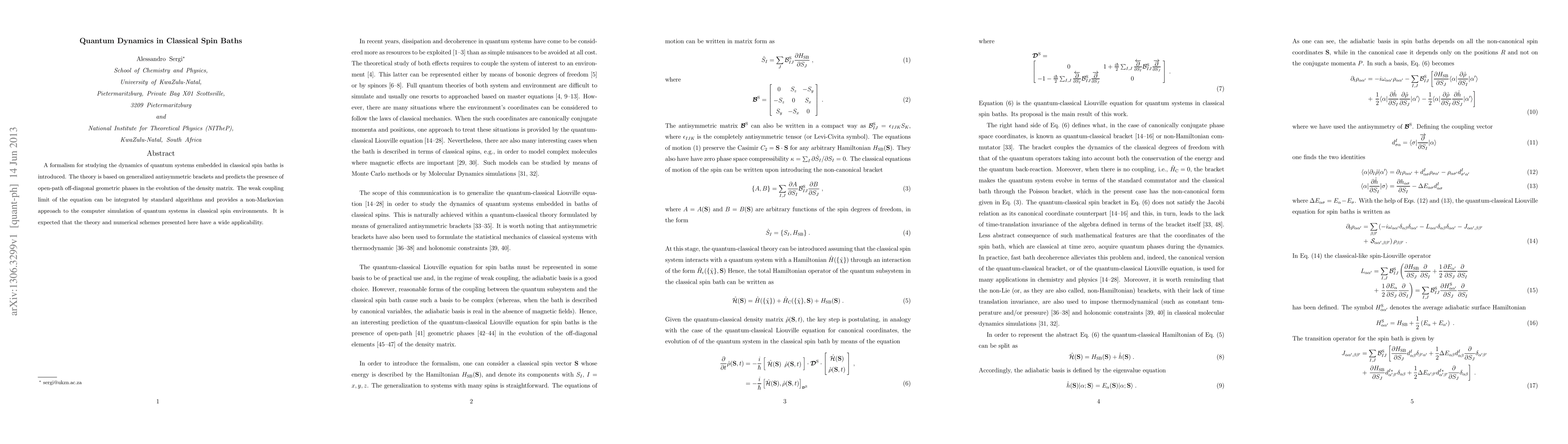 This paper introduces a formalism for studying quantum dynamics in classical spin baths using generalized antisymmetric brackets, predicting open-path off-diagonal geometric phases in the density matrix evolution. The weak coupling limit allows for non-Markovian simulation via standard algorithms, offering a broadly applicable approach.