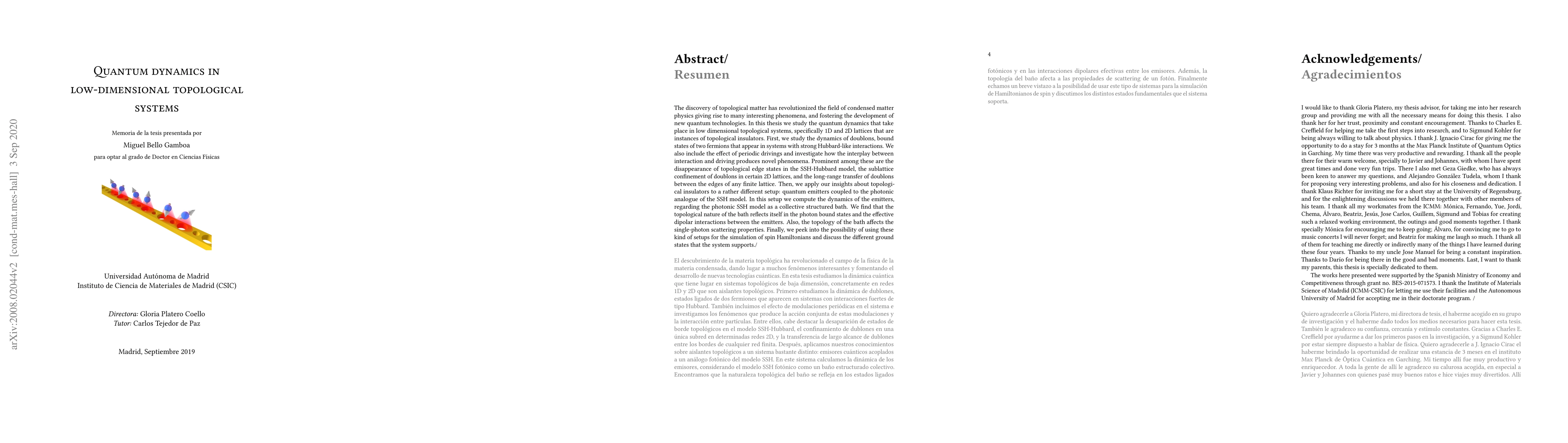 The discovery of topological matter has revolutionized the field of condensed matter physics giving rise to many interesting phenomena, and fostering the development of new quantum technologies. In this thesis we study the quantum dynamics that take place in low dimensional topological systems, specifically 1D and 2D lattices that are instances of topological insulators. First, we study the dynamics of doublons, bound states of two fermions that appear in systems with strong Hubbard-like interactions. We also include the effect of periodic drivings and investigate how the interplay between interaction and driving produces novel phenomena. Prominent among these are the disappearance of topological edge states in the SSH-Hubbard model, the sublattice confinement of doublons in certain 2D lattices, and the long-range transfer of doublons between the edges of any finite lattice. Then, we apply our insights about topological insulators to a rather different setup: quantum emitters coupled to the photonic analogue of the SSH model. In this setup we compute the dynamics of the emitters, regarding the photonic SSH model as a collective structured bath. We find that the topological nature of the bath reflects itself in the photon bound states and the effective dipolar interactions between the emitters. Also, the topology of the bath affects the single-photon scattering properties. Finally, we peek into the possibility of using these kind of setups for the simulation of spin Hamiltonians and discuss the different ground states that the system supports.