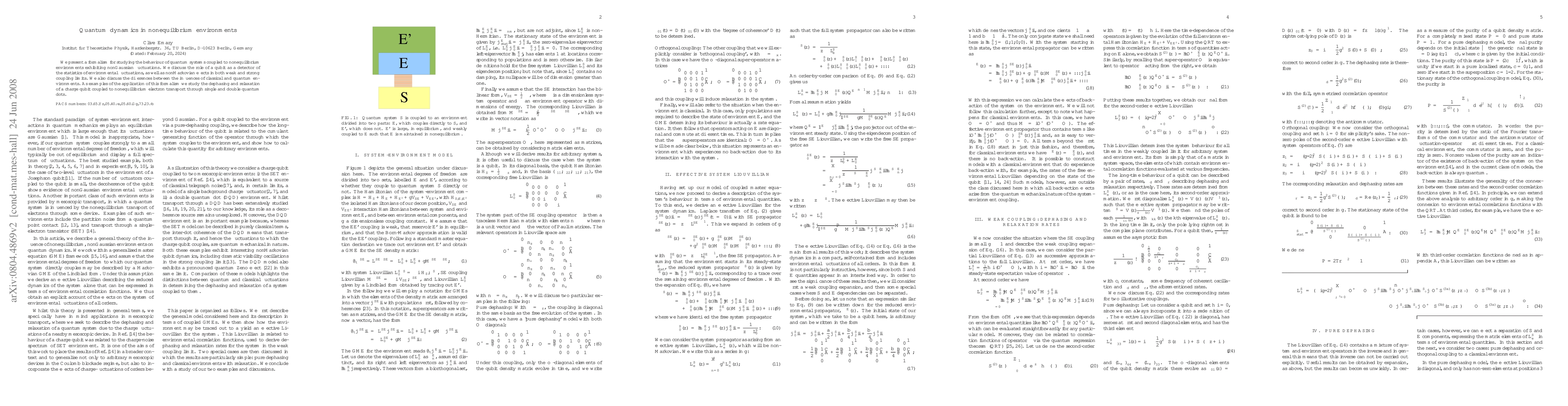 We present a formalism for studying the behaviour of quantum systems coupled to nonequilibrium environments exhibiting nonGaussian fluctuations. We discuss the role of a qubit as a detector of the statistics of environmental fluctuations, as well as nonMarkovian effects in both weak and strong coupling limits. We also discuss the differences between the influences of classical and quantum environments. As examples of the application of this formalism we study the dephasing and relaxation of a charge qubit coupled to nonequillibrium electron transport through single and double quantum dots.