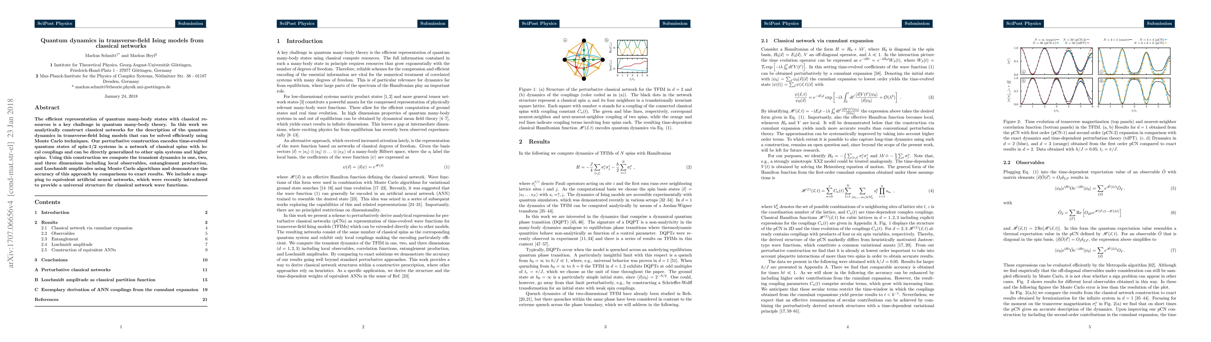 The efficient representation of quantum many-body states with classical resources is a key challenge in quantum many-body theory. In this work we analytically construct classical networks for the description of the quantum dynamics in transverse-field Ising models that can be solved efficiently using Monte Carlo techniques. Our perturbative construction encodes time-evolved quantum states of spin-1/2 systems in a network of classical spins with local couplings and can be directly generalized to other spin systems and higher spins. Using this construction we compute the transient dynamics in one, two, and three dimensions including local observables, entanglement production, and Loschmidt amplitudes using Monte Carlo algorithms and demonstrate the accuracy of this approach by comparisons to exact results. We include a mapping to equivalent artificial neural networks, which were recently introduced to provide a universal structure for classical network wave functions.