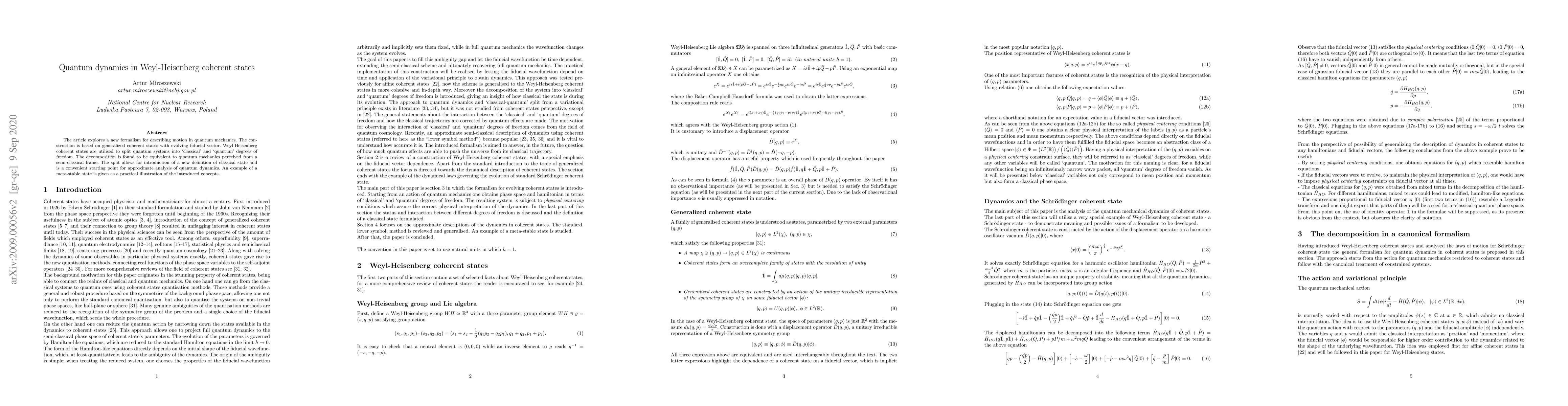 The article explores a new formalism for describing motion in quantum mechanics. The construction is based on generalized coherent states with evolving fiducial vector. Weyl-Heisenberg coherent states are utilised to split quantum systems into `classical' and `quantum' degrees of freedom. The decomposition is found to be equivalent to quantum mechanics perceived from a semi-classical frame. The split allows for introduction of a new definition of classical state and is a convenient starting point for approximate analysis of quantum dynamics. An example of a meta-stable state is given as a practical illustration of the introduced concepts.