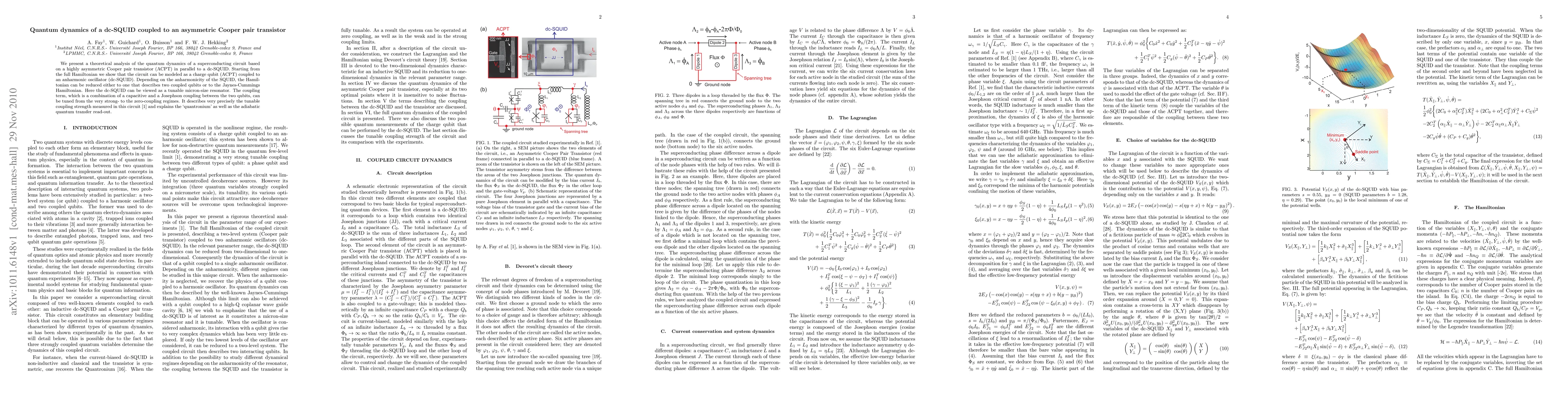 We present a theoretical analysis of the quantum dynamics of a superconducting circuit based on a highly asymmetric Cooper pair transistor (ACPT) in parallel to a dc-SQUID. Starting from the full Hamiltonian we show that the circuit can be modeled as a charge qubit (ACPT) coupled to an anharmonic oscillator (dc-SQUID). Depending on the anharmonicity of the SQUID, the Hamiltonian can be reduced either to one that describes two coupled qubits or to the Jaynes-Cummings Hamiltonian. Here the dc-SQUID can be viewed as a tunable micron-size resonator. The coupling term, which is a combination of a capacitive and a Josephson coupling between the two qubits, can be tuned from the very strong- to the zero-coupling regimes. It describes very precisely the tunable coupling strength measured in this circuit and explains the 'quantronium' as well as the adiabatic quantum transfer read-out.