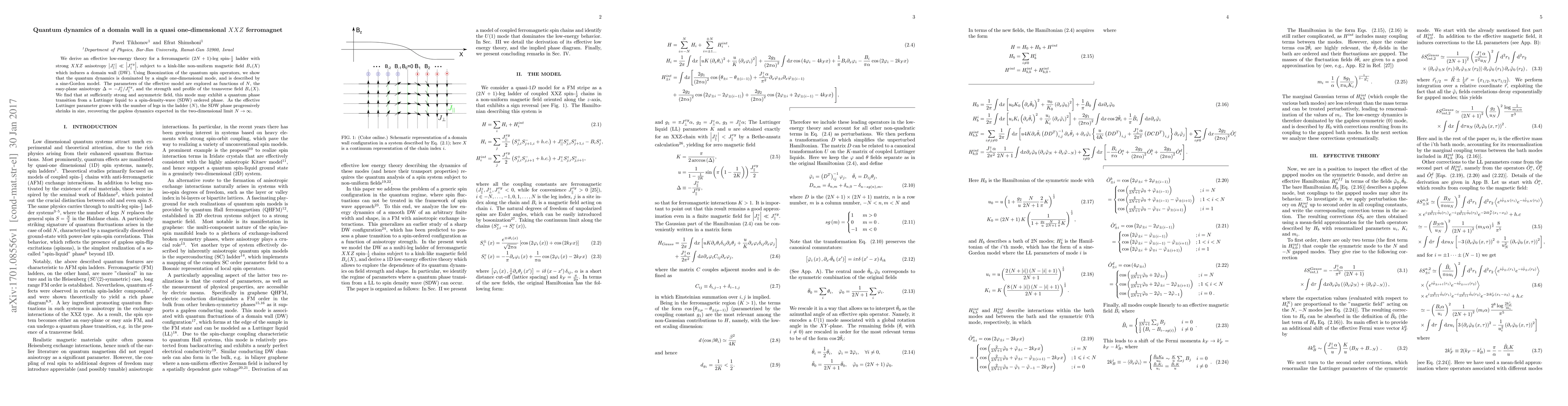 We derive an effective low-energy theory for a ferromagnetic $(2N+1)$-leg spin-$\frac{1}{2}$ ladder with strong $XXZ$ anisotropy $\left|J_{\parallel}^z\right|\ll \left|J_{\parallel}^{xy}\right|$, subject to a kink-like non-uniform magnetic field $B_z(X)$ which induces a domain wall (DW). Using Bosonization of the quantum spin operators, we show that the quantum dynamics is dominated by a single one-dimensional mode, and is described by a sine-Gordon model. The parameters of the effective model are explored as functions of $N$, the easy-plane anisotropy $\Delta=-J_{\parallel}^z/J_{\parallel}^{xy}$, and the strength and profile of the transverse field $B_z(X)$. We find that at sufficiently strong and asymmetric field, this mode may exhibit a quantum phase transition from a Luttinger liquid to a spin-density-wave (SDW) ordered phase. As the effective Luttinger parameter grows with the number of legs in the ladder ($N$), the SDW phase progressively shrinks in size, recovering the gapless dynamics expected in the two-dimensional limit $N\rightarrow\infty$.