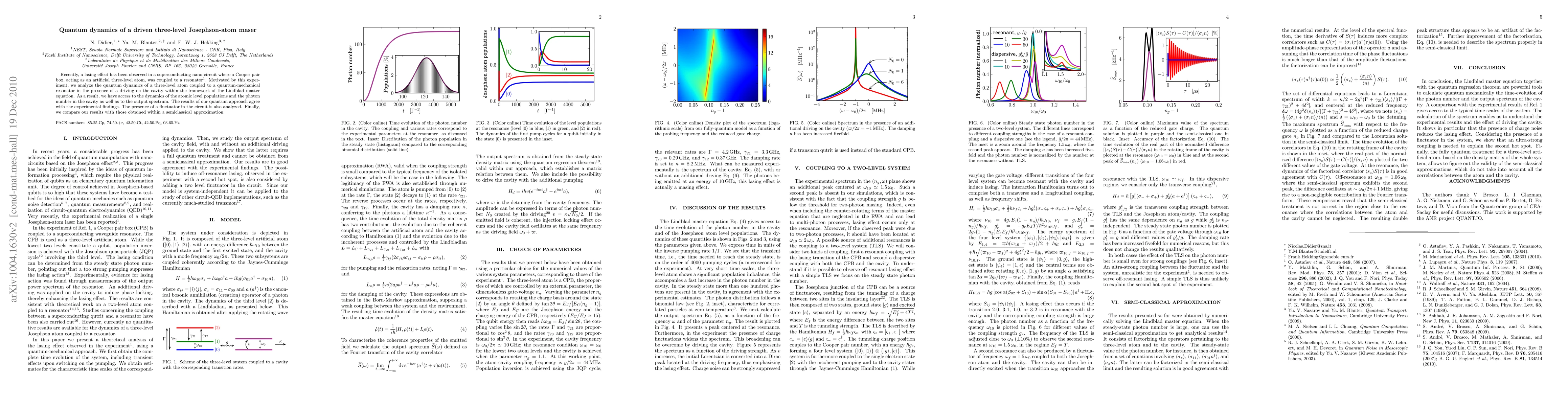 Recently, a lasing effect has been observed in a superconducting nano-circuit where a Cooper pair box, acting as an artificial three-level atom, was coupled to a resonator. Motivated by this experiment, we analyze the quantum dynamics of a three-level atom coupled to a quantum-mechanical resonator in the presence of a driving on the cavity within the framework of the Lindblad master equation. As a result, we have access to the dynamics of the atomic level populations and the photon number in the cavity as well as to the output spectrum. The results of our quantum approach agree with the experimental findings. The presence of a fluctuator in the circuit is also analyzed. Finally, we compare our results with those obtained within a semiclassical approximation.
