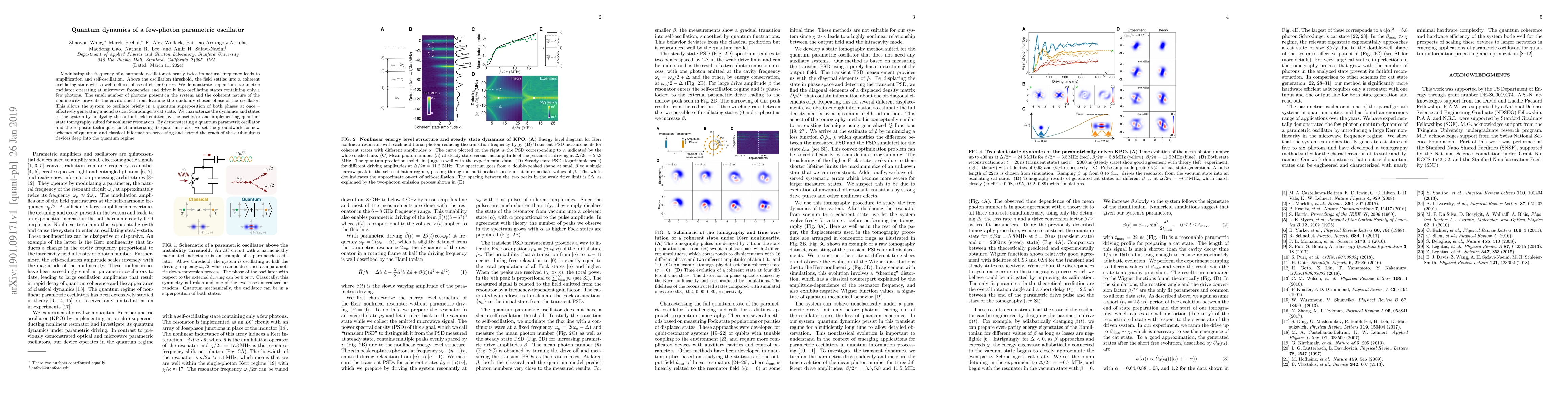 This paper demonstrates a quantum parametric oscillator at microwave frequencies that can operate with only a few photons, achieving a coherent oscillating state. The system can briefly oscillate in a superposition of both $0$ and $\pi$ phase states, generating a nonclassical Schrödinger's cat state, and is characterized using quantum state tomography.