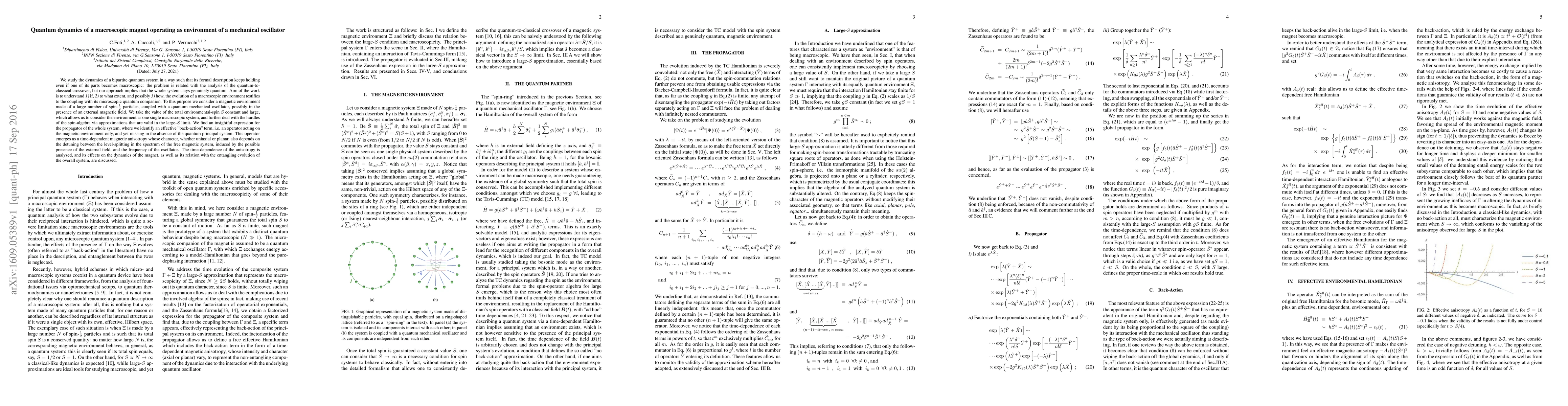 We study the dynamics of a bipartite quantum system in a way such that its formal description keeps holding even if one of its parts becomes macroscopic: the problem is related with the analysis of the quantum-to-classical crossover, but our approach implies that the whole system stays genuinely quantum. Aim of the work is to understand 1) if, 2) to what extent, and possibly 3) how, the evolution of a macroscopic environment testifies to the coupling with its microscopic quantum companion. To this purpose we consider a magnetic environment made of a large number of spin-1/2 particles, coupled with a quantum mechanical oscillator, possibly in the presence of an external magnetic field. We take the value of the total environmental-spin S constant and large, which allows us to consider the environment as one single macroscopic system, and further deal with the hurdles of the spin-algebra via approximations that are valid in the large-S limit. We find an insightful expression for the propagator of the whole system, where we identify an effective "back-action" term, i.e. an operator acting on the magnetic environment only, and yet missing in the absence of the quantum principal system. This operator emerges as a time-dependent magnetic anisotropy whose character, whether uniaxial or planar, also depends on the detuning between the level-splitting in the spectrum of the free magnetic system, induced by the possible presence of the external field, and the frequency of the oscillator. The time-dependence of the anisotropy is analysed, and its effects on the dynamics of the magnet, as well as its relation with the entangling evolution of the overall system, are discussed.
