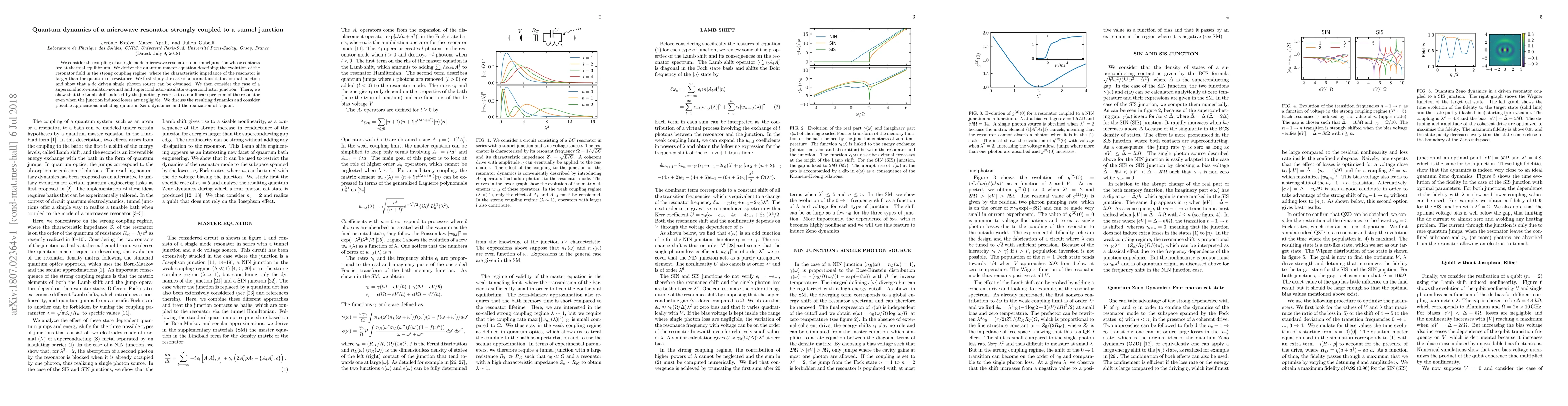 This paper derives a quantum master equation for a microwave resonator strongly coupled to a tunnel junction, demonstrating the potential for a dc driven single photon source in normal-insulator-normal junctions and a nonlinear resonator spectrum in superconductor-insulator-normal/superconductor junctions due to the Lamb shift, with implications for quantum Zeno dynamics and qubit realization.