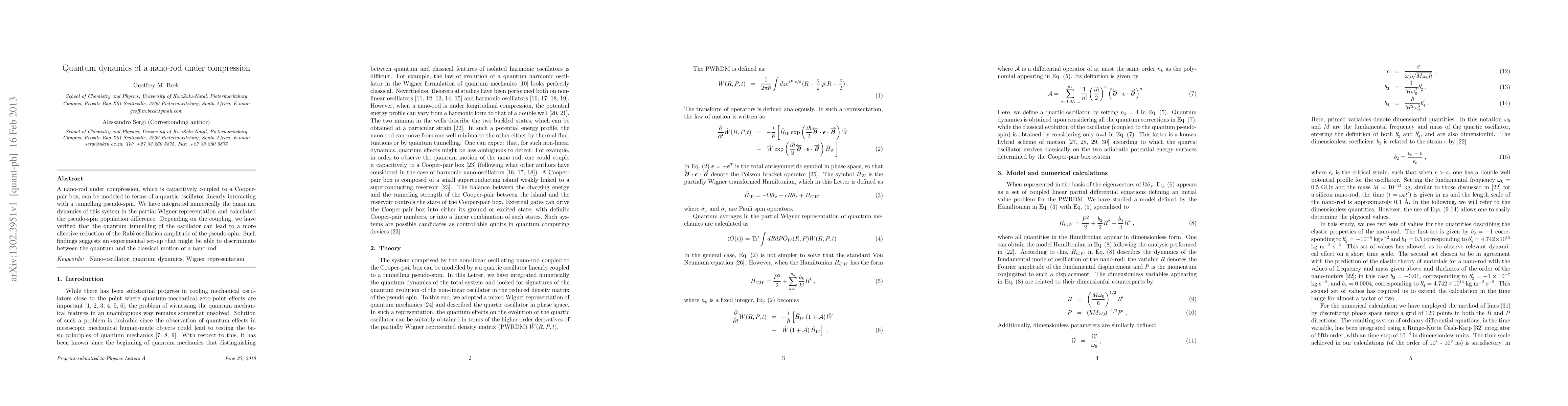 A nano-rod under compression, which is capacitively coupled to a Cooper-pair box, can be modeled in terms of a quartic oscillator linearly interacting with a tunnelling pseudo-spin. We have integrated numerically the quantum dynamics of this system in the partial Wigner representation and calculated the pseudo-spin population difference. Depending on the coupling, we have verified that the quantum tunnelling of the oscillator can lead to a more effective reduction of the Rabi oscillation amplitude of the pseudo-spin. Such findings suggests an experimental set-up that might be able to discriminate between the quantum and the classical motion of a nano-rod.