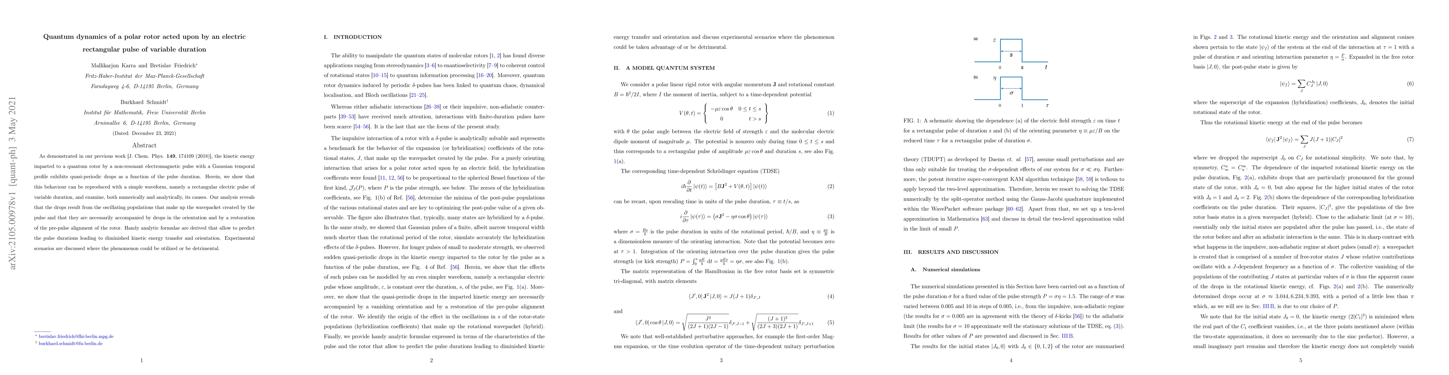 Researchers study the effect of a variable-duration rectangular electric pulse on a quantum rotor, discovering that it can create quasi-periodic drops in kinetic energy transfer, accompanied by changes in rotor orientation.