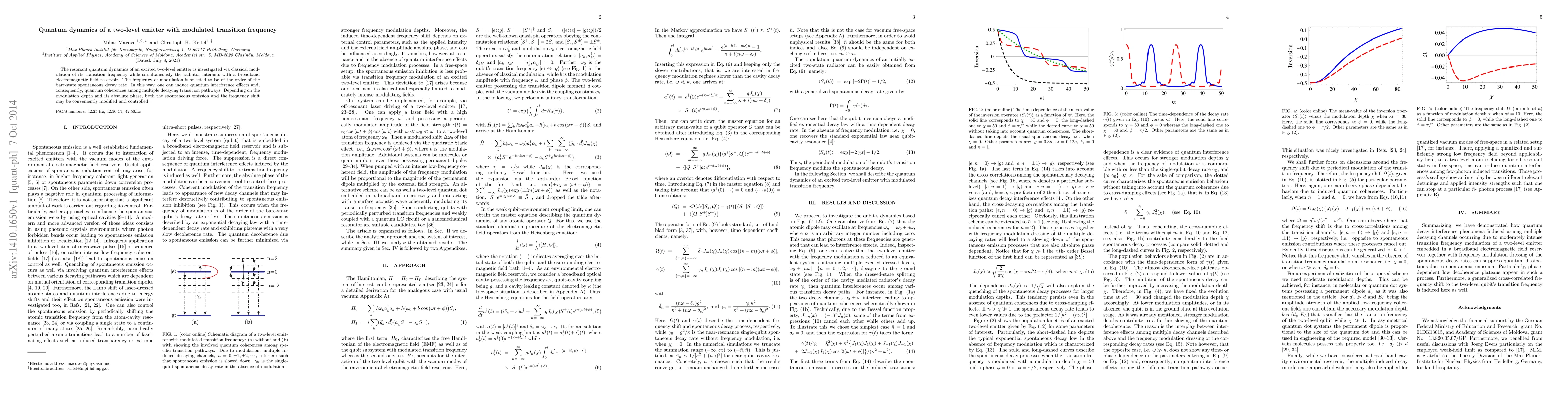Researchers investigated how controlling a two-level emitter's transition frequency affects its quantum dynamics, leading to controlled modification of spontaneous emission and frequency shift.