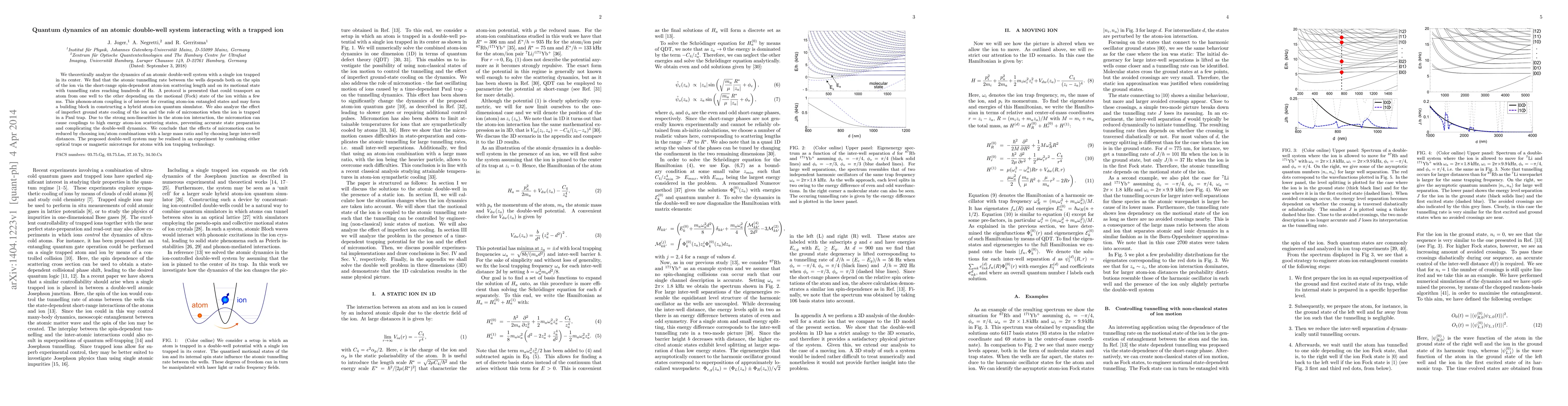 This paper theoretically explores the quantum dynamics of an atomic double-well system interacting with a trapped ion, revealing that the atomic tunnelling rate is influenced by the ion's spin and motional state, potentially enabling sub-millisecond atom transport based on ion phonon states. The study also discusses the impact of micromotion in Paul traps and suggests strategies to mitigate these effects for potential experimental realization.