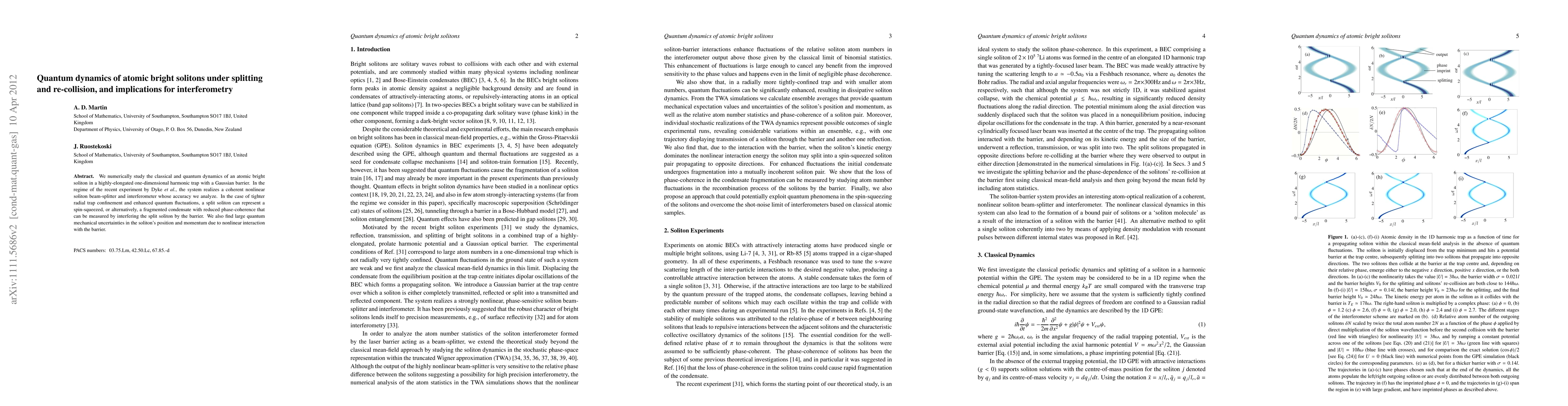 We numerically study the classical and quantum dynamics of an atomic bright soliton in a highly-elongated one-dimensional harmonic trap with a Gaussian barrier. In the regime of the recent experiment by Dyke {\it et al.}, the system realizes a coherent nonlinear soliton beam-splitter and interferometer whose accuracy we analyze. In the case of tighter radial trap confinement and enhanced quantum fluctuations, a split soliton can represent a spin-squeezed, or alternatively, a fragmented condensate with reduced phase-coherence that can be measured by interfering the split soliton by the barrier. We also find large quantum mechanical uncertainties in the soliton's position and momentum due to nonlinear interaction with the barrier.