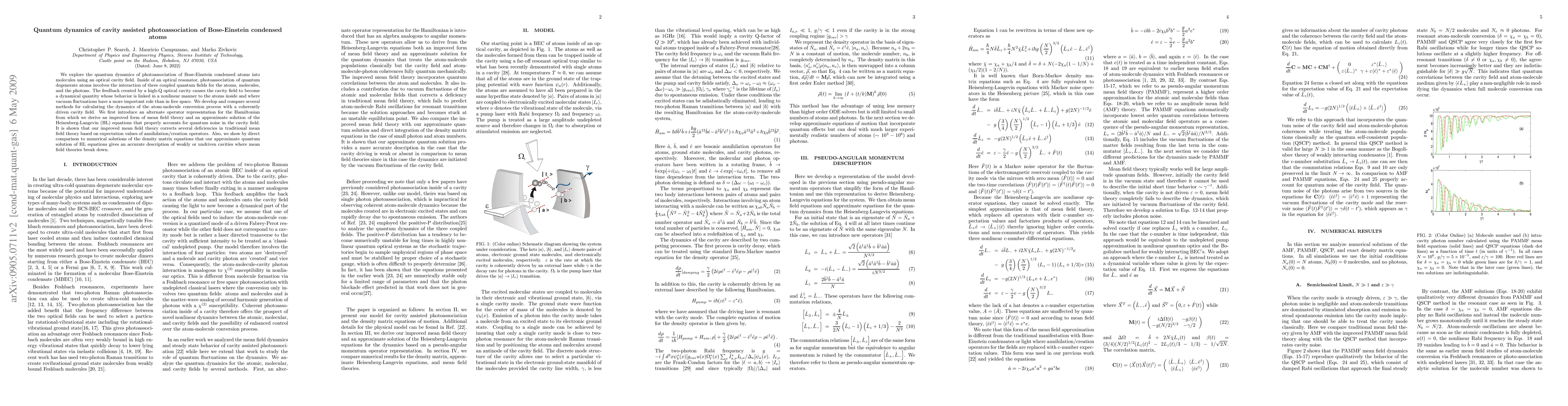 This paper investigates the quantum dynamics of photoassociation in Bose-Einstein condensates using an optical cavity, focusing on the interplay between atoms, molecules, and photons within the cavity. It proposes an improved mean field theory and an approximate solution of the Heisenberg-Langevin equations that accurately describe the atom-molecule conversion process, especially in weakly driven cavities where traditional mean field theories fail.