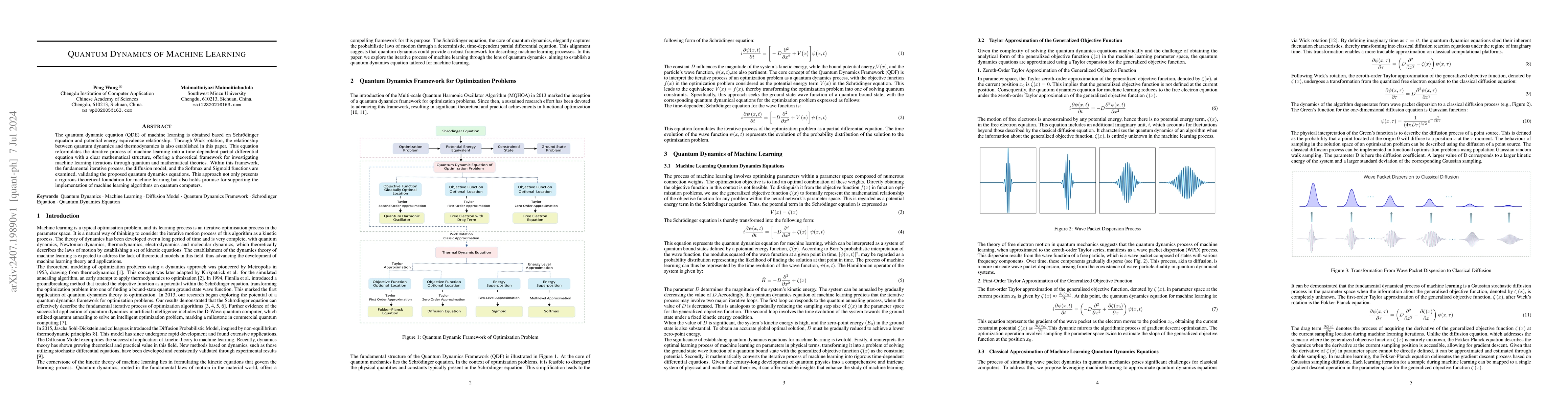 This paper develops a quantum dynamic equation (QDE) for machine learning based on Schrödinger's equation and establishes a link between quantum dynamics and thermodynamics via Wick rotation. The proposed QDE reformulates machine learning iterations as a time-dependent partial differential equation, offering a robust theoretical framework that validates fundamental processes like diffusion models and activation functions, potentially enabling quantum computing applications.