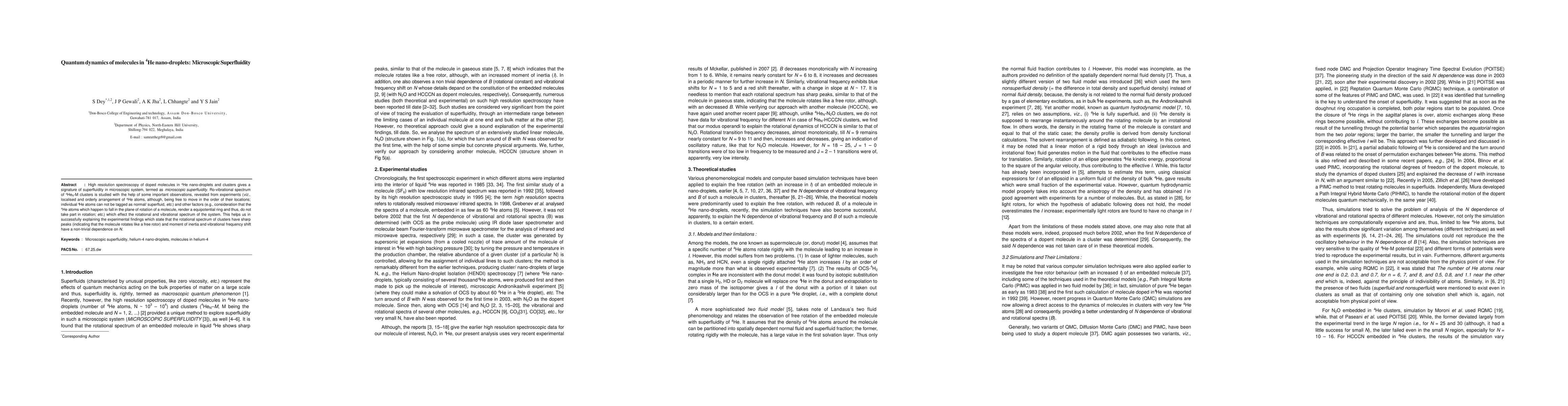 High resolution spectroscopy of doped molecules in 4He nano-droplets and clusters gives a signature of superfluidity in microscopic system, termed as microscopic superfluidity. Ro-vibrational spectrum of 4HeN-M clusters is studied with the help of some important observations, revealed from experiments (viz., localised and orderly arrangement of 4He atoms, although, being free to move in the order of their locations; individual 4He atoms can not be tagged as normal/ superfluid, etc.) and other factors (e.g., consideration that the 4He atoms which happen to fall in the plane of rotation of a molecule, render a equipotential ring and thus, do not take part in rotation; etc.) which effect the rotational and vibrational spectrum of the system. This helps us in successfully explaining the experimental findings which state that the rotational spectrum of clusters have sharp peaks (indicating that the molecule rotates like a free rotor) and moment of inertia and vibrational frequency shift have a non-trivial dependence on N.
