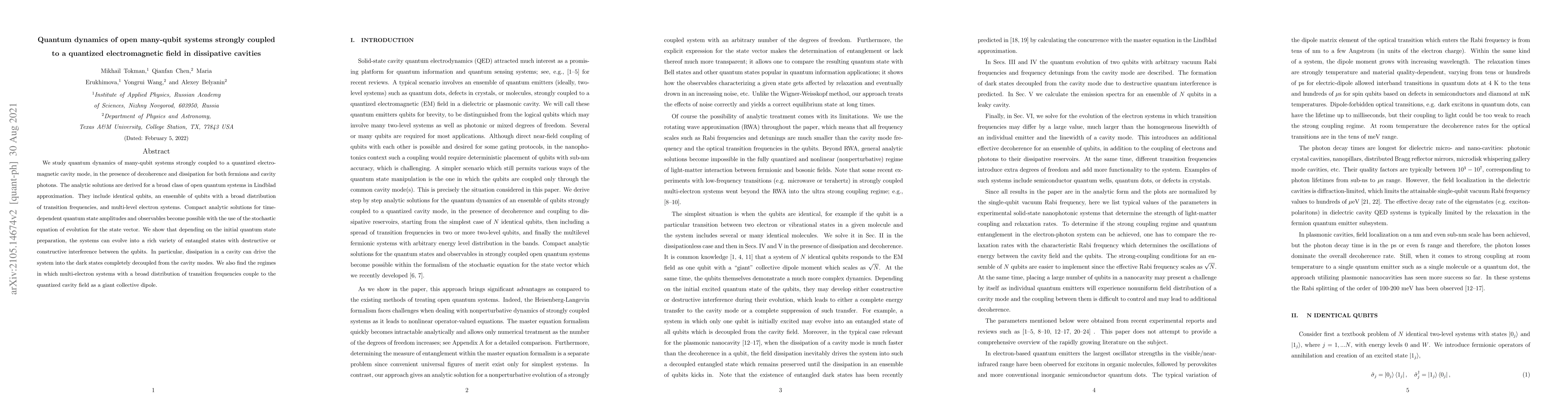 This paper derives analytic solutions for the quantum dynamics of many-qubit systems strongly coupled to a quantized electromagnetic field in dissipative cavities, revealing the formation of entangled states and the emergence of dark states due to cavity-induced dissipation. The study covers various qubit configurations and highlights collective dipole behavior in multi-electron systems.