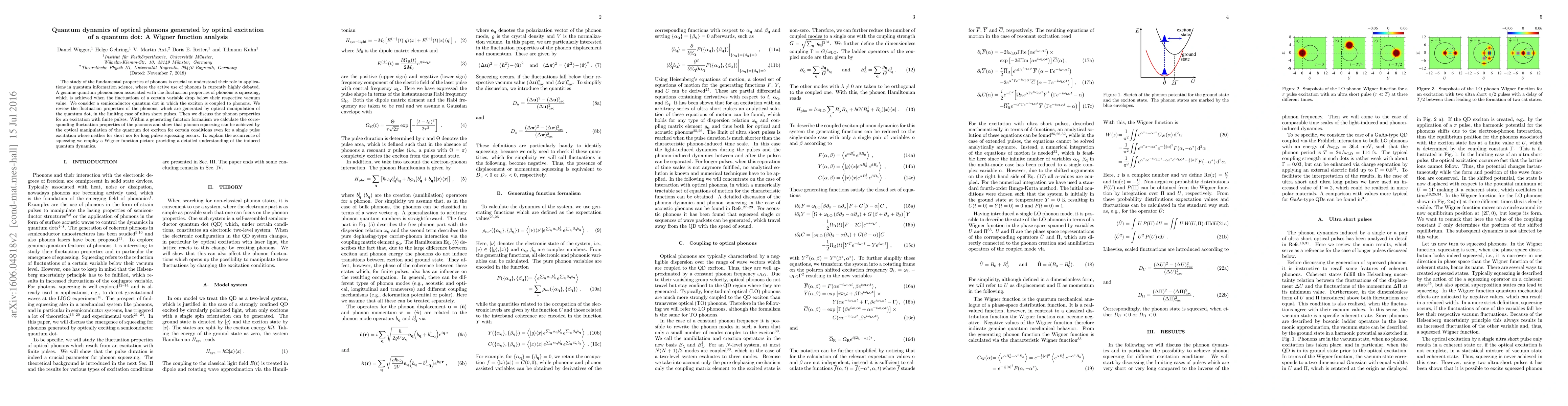 The study of the fundamental properties of phonons is crucial to understand their role in applica- tions in quantum information science, where the active use of phonons is currently highly debated. A genuine quantum phenomenon associated with the fluctuation properties of phonons is squeezing, which is achieved when the fluctuations of a certain variable drop below their respective vacuum value. We consider a semiconductor quantum dot in which the exciton is coupled to phonons. We review the fluctuation properties of the phonons, which are generated by optical manipulation of the quantum dot, in the limiting case of ultra short pulses. Then we discuss the phonon properties for an excitation with finite pulses. Within a generating function formalism we calculate the corre- sponding fluctuation properties of the phonons and show that phonon squeezing can be achieved by the optical manipulation of the quantum dot exciton for certain conditions even for a single pulse excitation where neither for short nor for long pulses squeezing occurs. To explain the occurrence of squeezing we employ a Wigner function picture providing a detailed understanding of the induced quantum dynamics.
