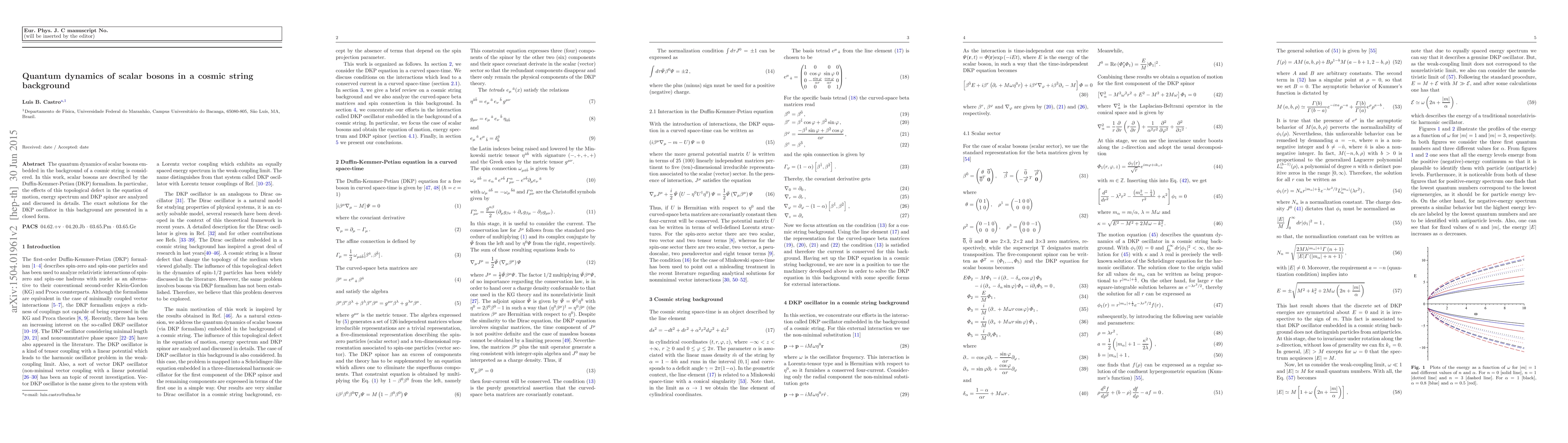 The quantum dynamics of scalar bosons embedded in the background of a cosmic string is considered. In this work, scalar bosons are described by the Duffin-Kemmer-Petiau (DKP) formalism. In particular, the effects of this topological defect in the equation of motion, energy spectrum and DKP spinor are analyzed and discussed in details. The exact solutions for the DKP oscillator in this background are presented in a closed form.