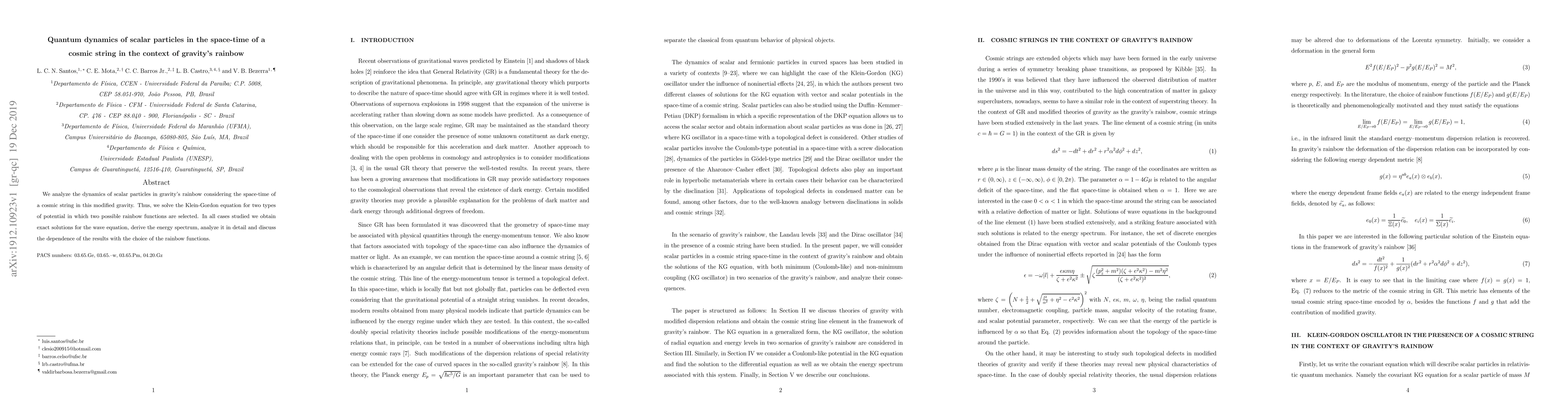 We analyze the dynamics of scalar particles in gravity's rainbow considering the space-time of a cosmic string in this modified gravity. Thus, we solve the Klein-Gordon equation for two types of potential in which two possible rainbow functions are selected. In all cases studied we obtain exact solutions for the wave equation, derive the energy spectrum, analyze it in detail and discuss the dependence of the results with the choice of the rainbow functions.
