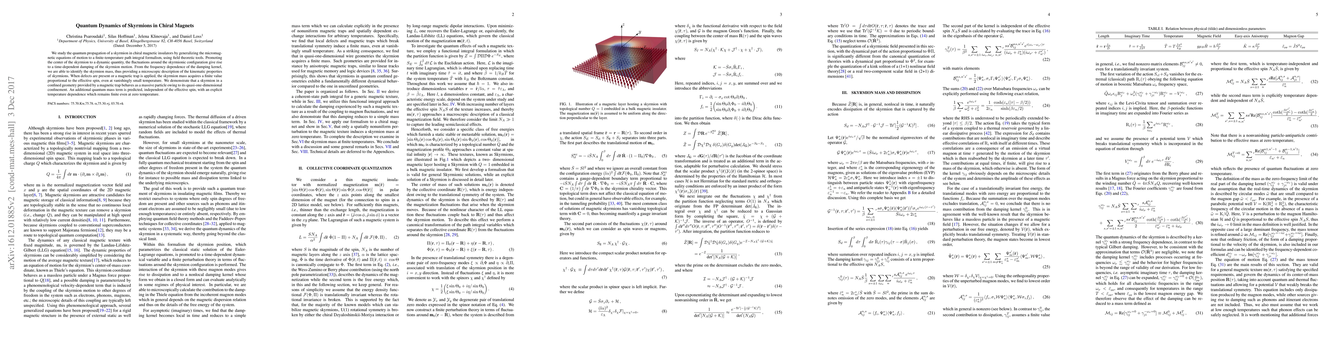 We study the quantum propagation of a Skyrmion in chiral magnetic insulators by generalizing the micromagnetic equations of motion to a finite-temperature path integral formalism, using field theoretic tools. Promoting the center of the Skyrmion to a dynamic quantity, the fluctuations around the Skyrmionic configuration give rise to a time-dependent damping of the Skyrmion motion. From the frequency dependence of the damping kernel, we are able to identify the Skyrmion mass, thus providing a microscopic description of the kinematic properties of Skyrmions. When defects are present or a magnetic trap is applied, the Skyrmion mass acquires a finite value proportional to the effective spin, even at vanishingly small temperature. We demonstrate that a Skyrmion in a confined geometry provided by a magnetic trap behaves as a massive particle owing to its quasi-one-dimensional confinement. An additional quantum mass term is predicted, independent of the effective spin, with an explicit temperature dependence which remains finite even at zero temperature.
