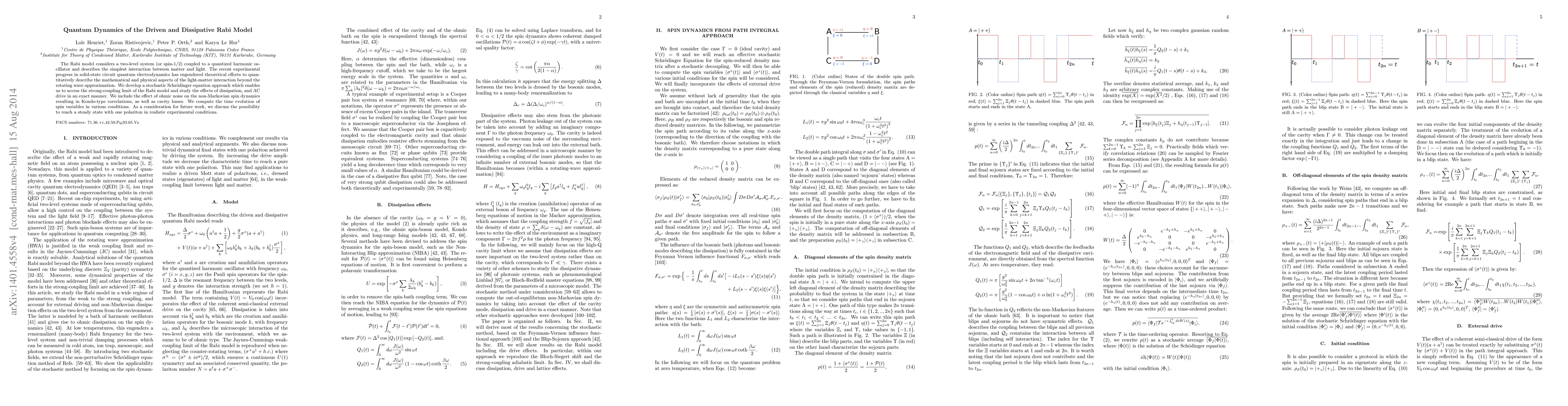 The Rabi model considers a two-level system (or spin-1/2) coupled to a quantized harmonic oscillator and describes the simplest interaction between matter and light. The recent experimental progress in solid-state circuit quantum electrodynamics has engendered theoretical efforts to quantitatively describe the mathematical and physical aspects of the light-matter interaction beyond the rotating wave approximation. We develop a stochastic Schr\"{o}dinger equation approach which enables us to access the strong-coupling limit of the Rabi model and study the effects of dissipation, and AC drive in an exact manner. We include the effect of ohmic noise on the non-Markovian spin dynamics resulting in Kondo-type correlations, as well as cavity losses. We compute the time evolution of spin variables in various conditions. As a consideration for future work, we discuss the possibility to reach a steady state with one polariton in realistic experimental conditions.