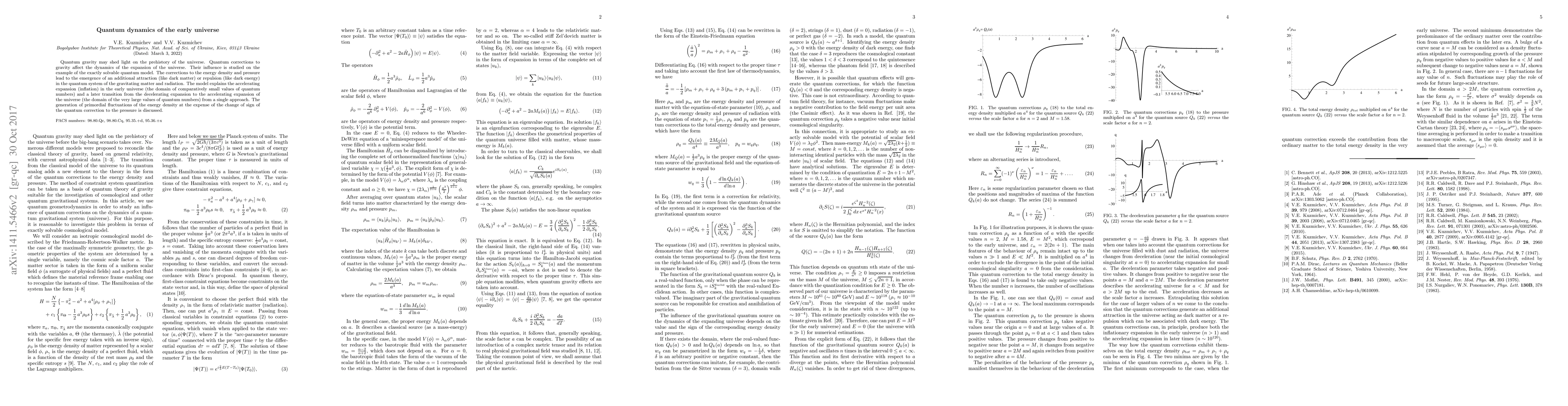 Quantum gravity may shed light on the prehistory of the universe. Quantum corrections to gravity affect the dynamics of the expansion of the universe. Their influence is studied on the example of the exactly solvable quantum model. The corrections to the energy density and pressure lead to the emergence of an additional attraction (like dark matter) or repulsion (like dark energy) in the quantum system of the gravitating matter and radiation. The model explains the accelerating expansion (inflation) in the early universe (the domain of comparatively small values of quantum numbers) and a later transition from the decelerating expansion to the accelerating expansion of the universe (the domain of the very large values of quantum numbers) from a single approach. The generation of primordial fluctuations of the energy density at the expense of the change of sign of the quantum correction to the pressure is discussed.