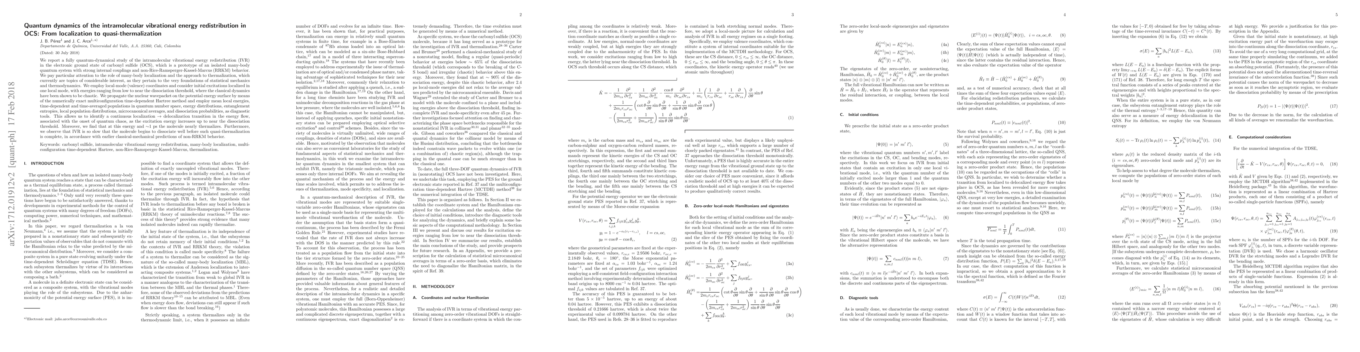 This study investigates the quantum dynamics of intramolecular vibrational energy redistribution in OCS, revealing a transition from many-body localization to quasi-thermalization as excitation energy approaches the dissociation threshold. The research employs the multiconfiguration time-dependent Hartree method to show that OCS exhibits non-RRKM behavior, with dissociation occurring before full thermalization.