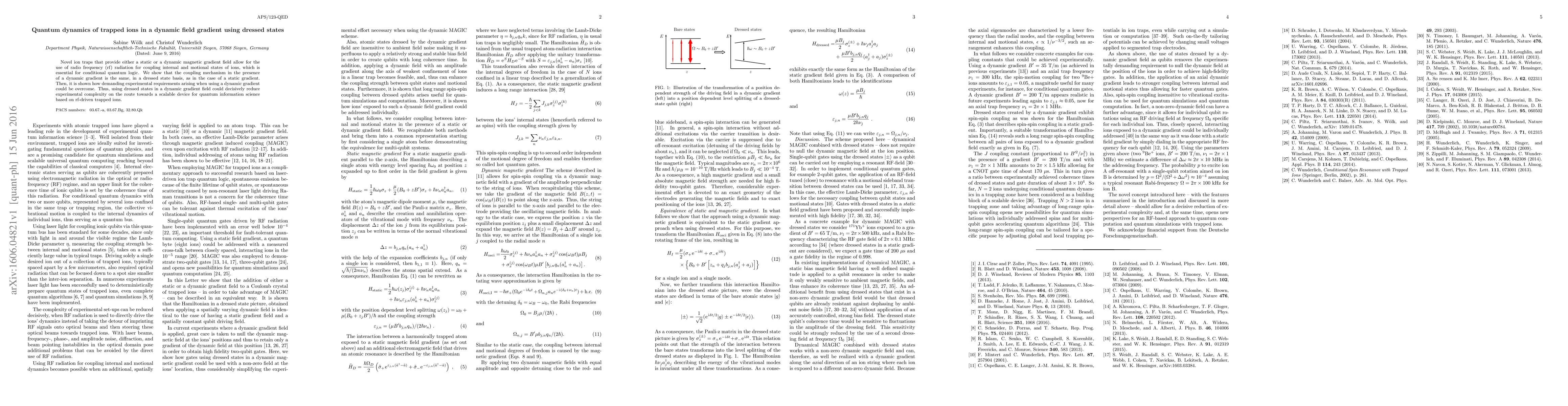 Novel ion traps that provide either a static or a dynamic magnetic gradient field allow for the use of radio frequency (rf) radiation for coupling internal and motional states of ions, which is essential for conditional quantum logic. We show that the coupling mechanism in the presence of a dynamic gradient is the same, in a dressed state basis, as in the case of a static gradient. Then, it is shown how demanding experimental requirements arising when using a dynamic gradient could be overcome. Thus, using dressed states in a dynamic gradient field could decisively reduce experimental complexity on the route towards a scalable device for quantum information science based on rf-driven trapped ions.